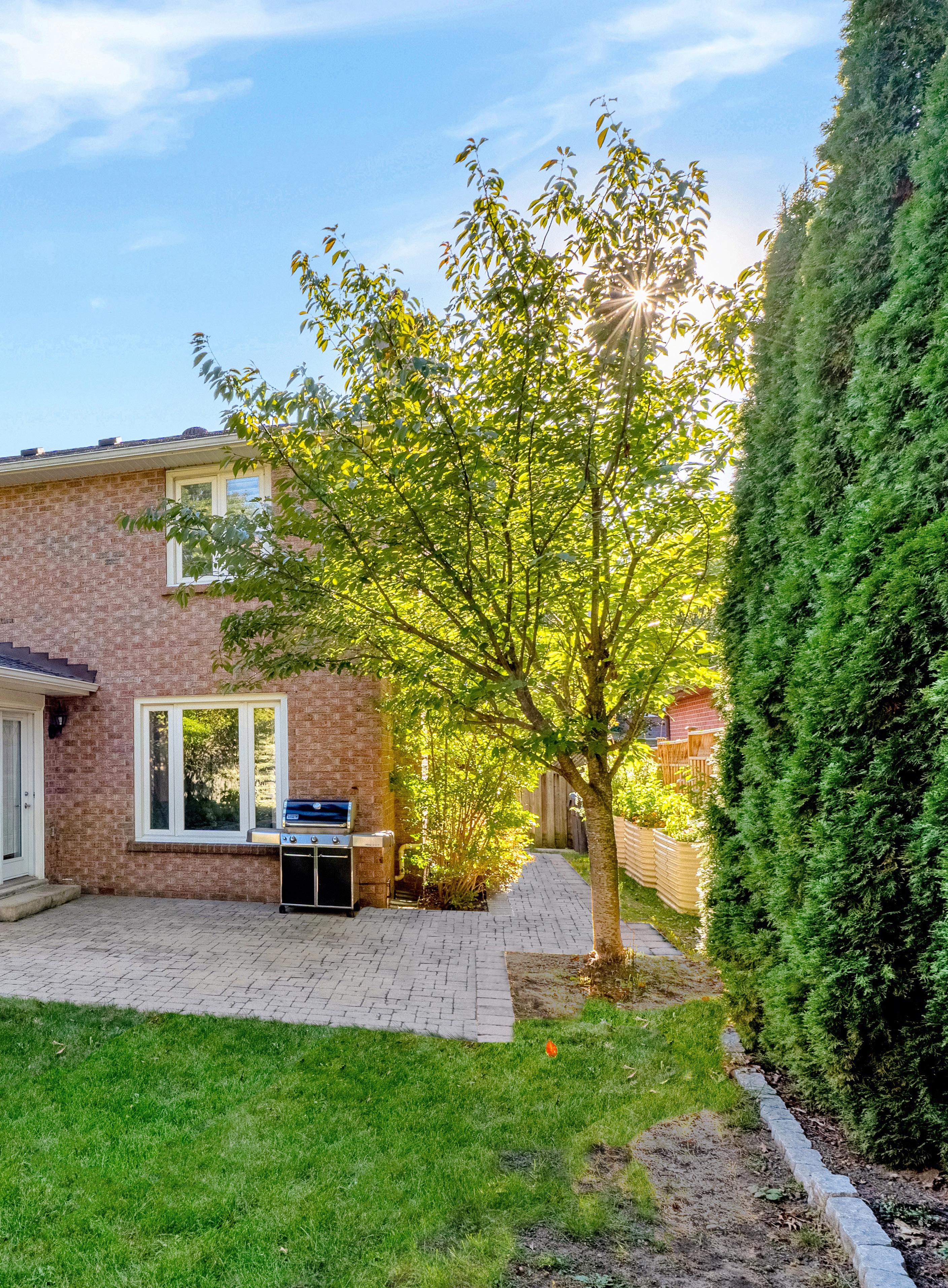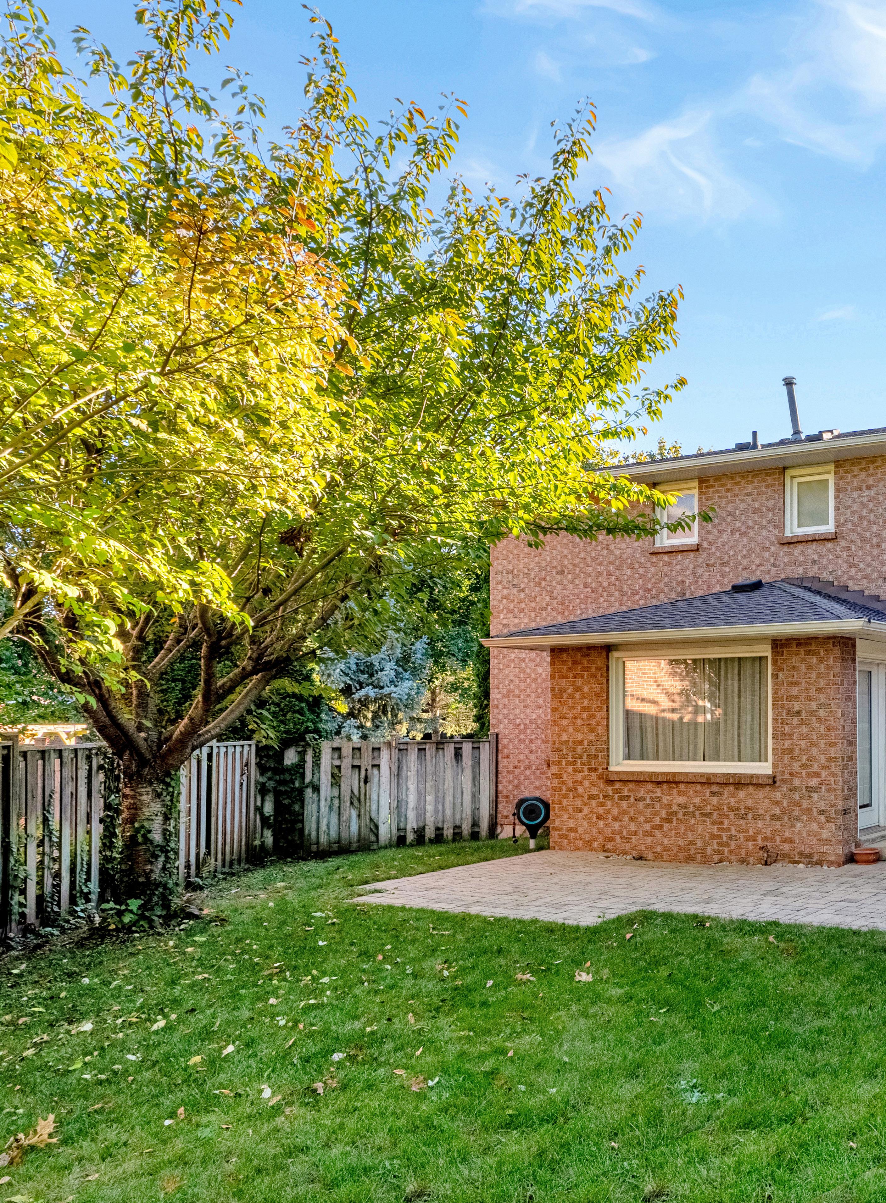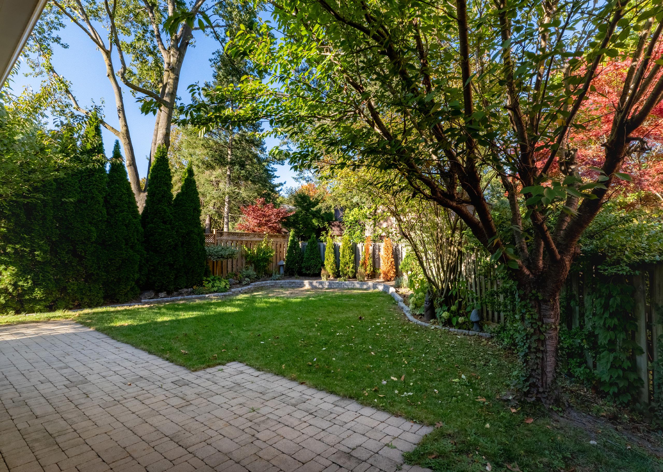 Outdoors, a private backyard oasis awaits, framed by mature trees and lush landscaping, and anchored by a charming brick-paved patio ideal for summer entertaining and quiet relaxation alike. With multiple walkouts, a full irrigation system, and a fully fenced setting, this serene outdoor environment offers both beauty and practicality for families and pets.