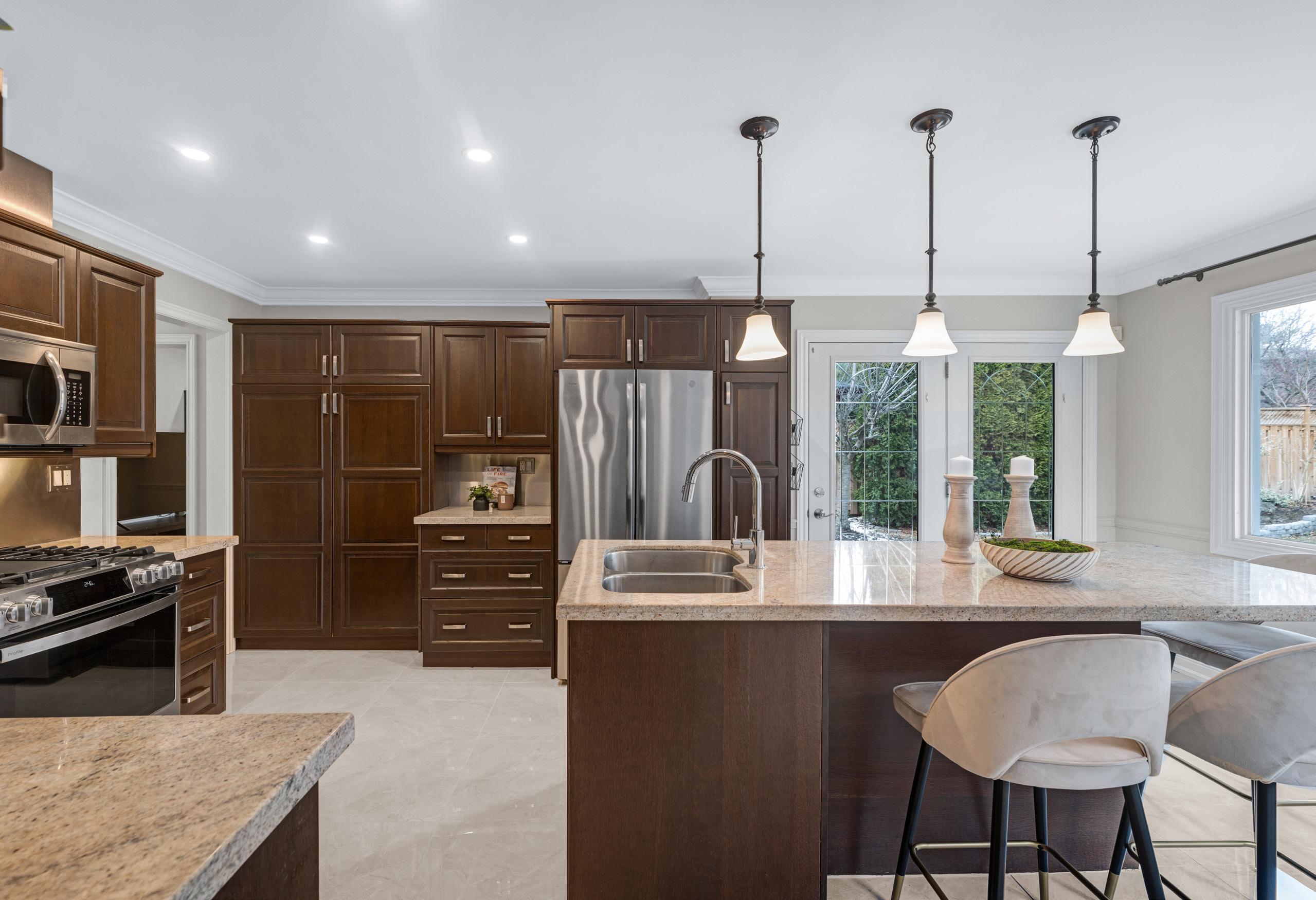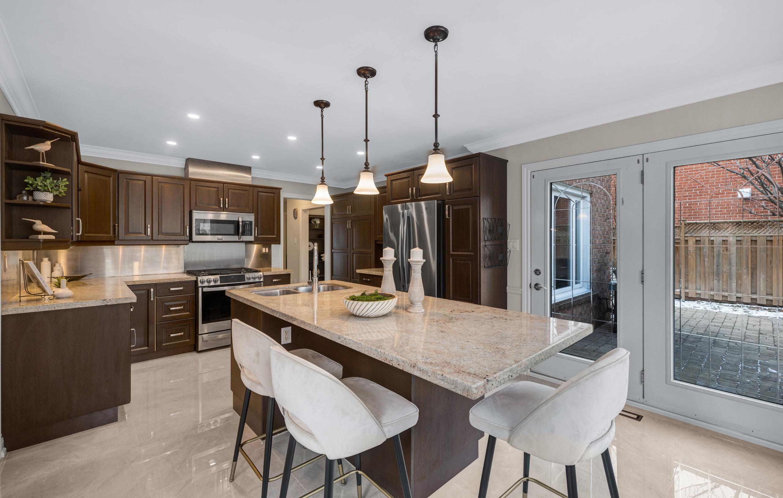 Morning routines and summer evenings are elevated by the seamless walkout to the backyard, where indoor and outdoor living harmoniously converge. Adjacent, a welcoming family room anchored by a cozy gas fireplace provides the perfect retreat, while