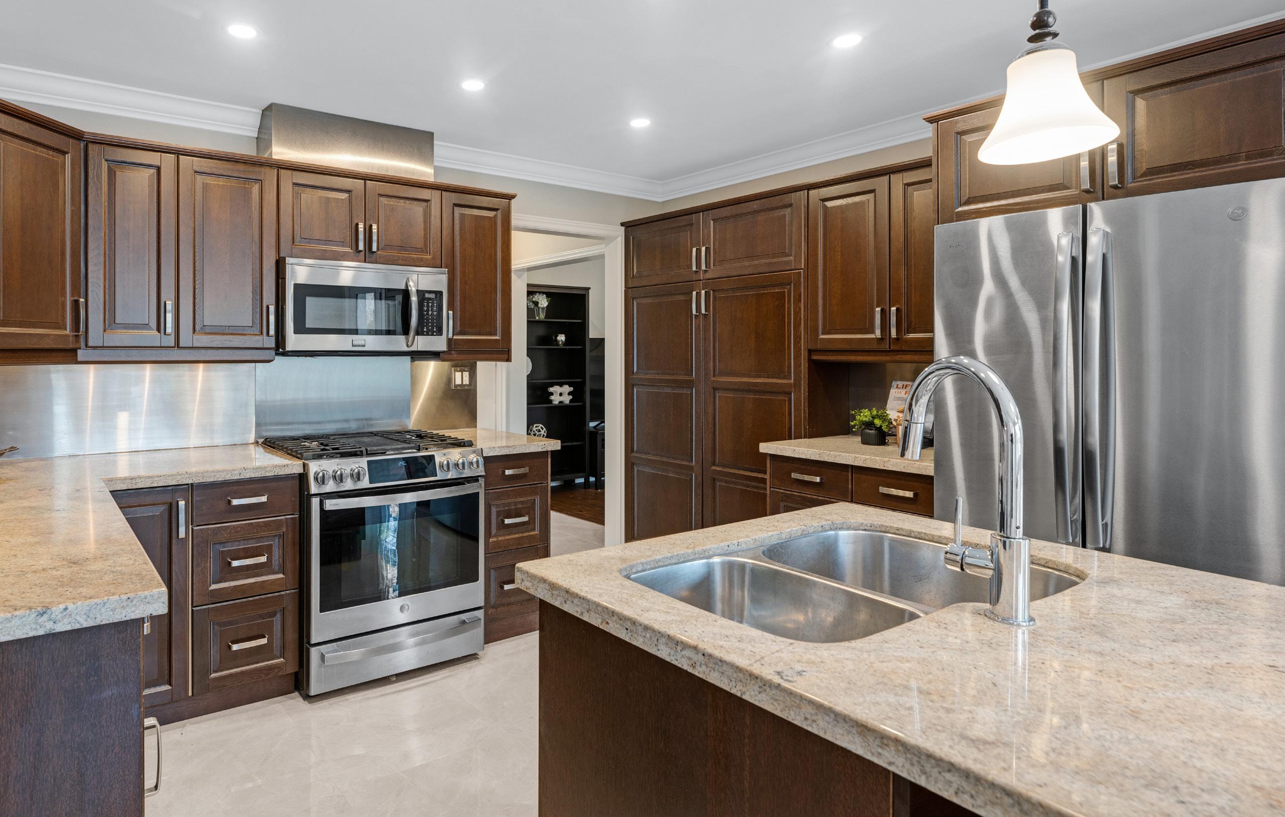 An elegant living and dining area unfolds effortlessly, offering an ideal setting for both intimate family gatherings and elevated entertaining. Flowing naturally into the heart of the home, the kitchen and breakfast area present a beautifully reimagined culinary space, complete with refinished cabinetry, granite countertops, stainless-steel appliances, and a central island designed for both practicality and connection.