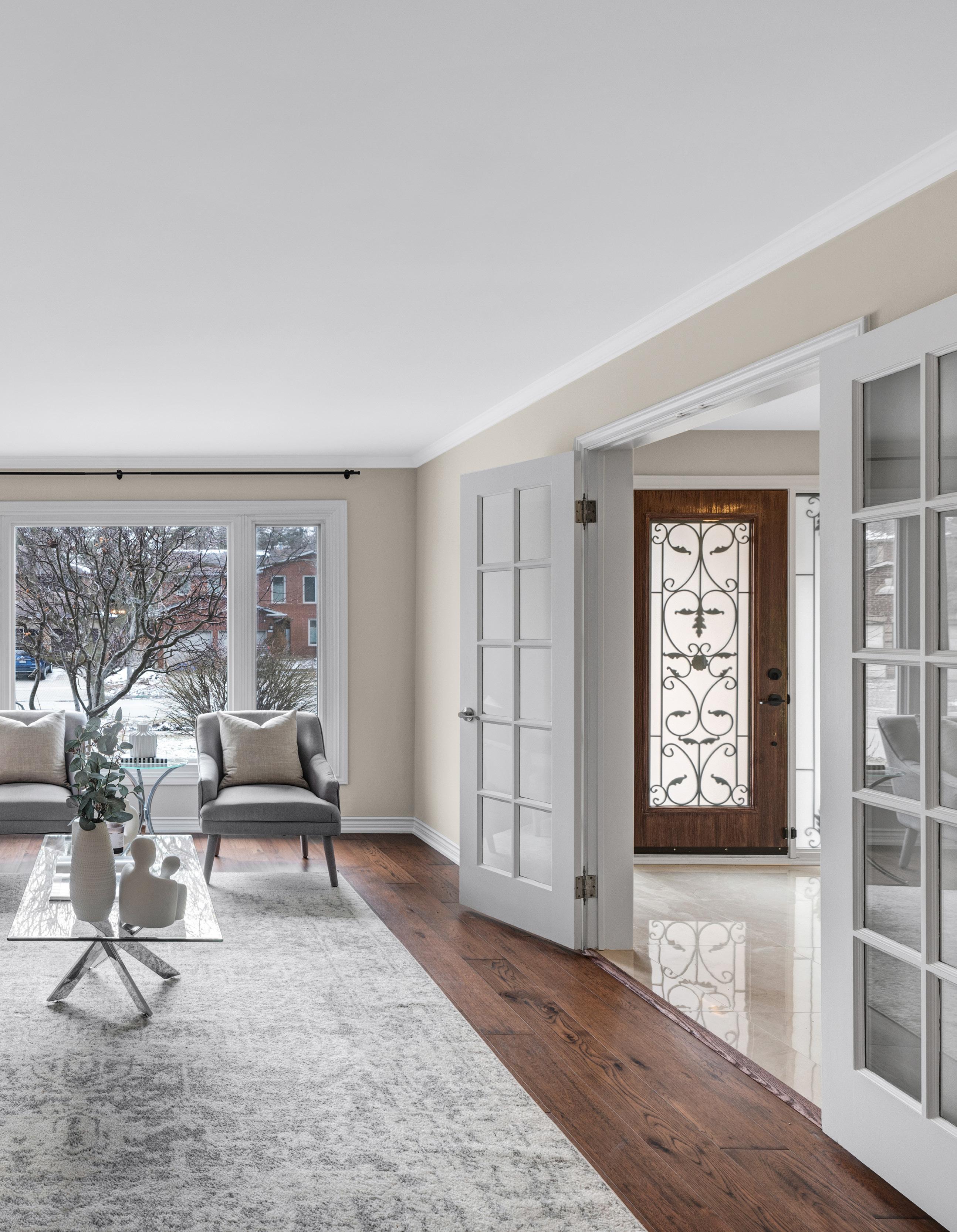 A warm and inviting presence welcomes you inside, where refined updates and a functional layout create a seamless blend of sophistication and comfort. Recently enhanced with new flooring and fresh paint, the principal spaces are bathed in natural light, with expansive windows framing tranquil views of the surrounding greenery while enhancing the home’s bright and airy ambiance.