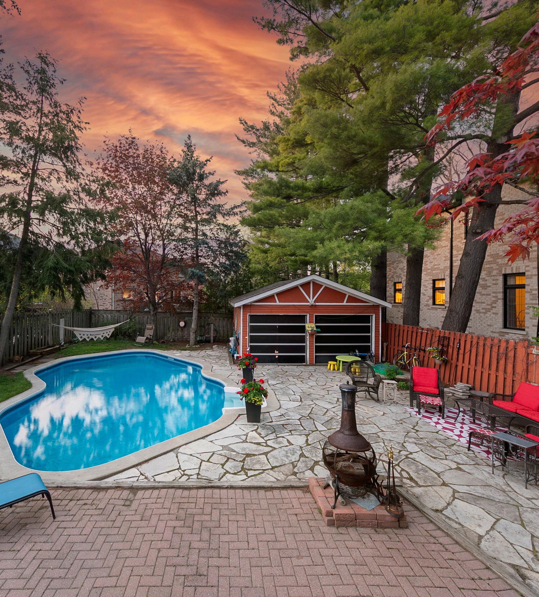 The spacious flagstone interlock patio provides the perfect spot for alfresco dining and entertaining, with plenty of seating and dining space for all your guests. If you’re looking for a more elevated experience, head up to the raised 20x20ft deck, where you can enjoy sweeping views of the backyard and pool.