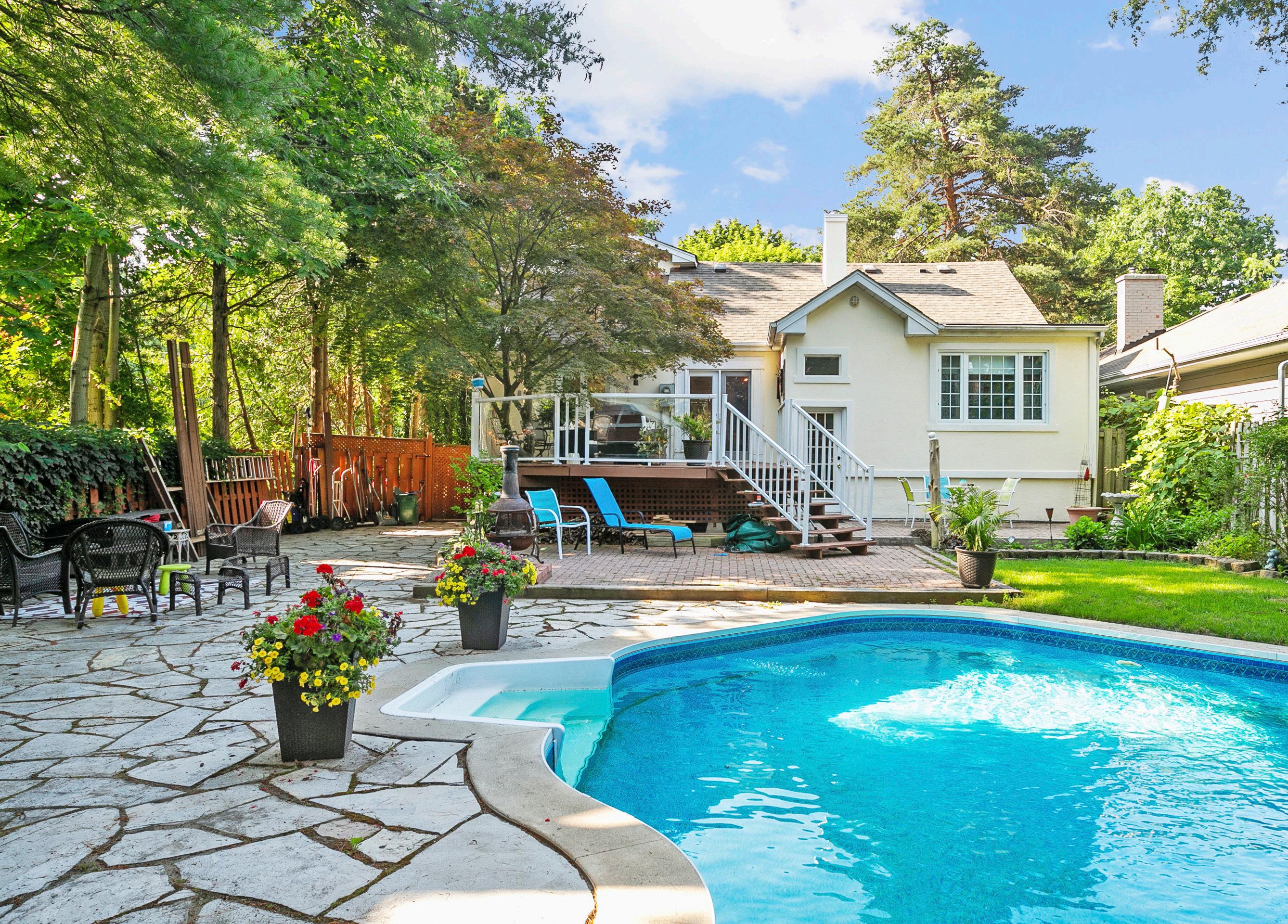 The captivating backyard features a well-kept inground 33x18x4.5ft chlorine pool. The flagstone interlock patio and raised deck provide abundant seating and dining space, making it the perfect entertainer’s oasis for any family and friends.
