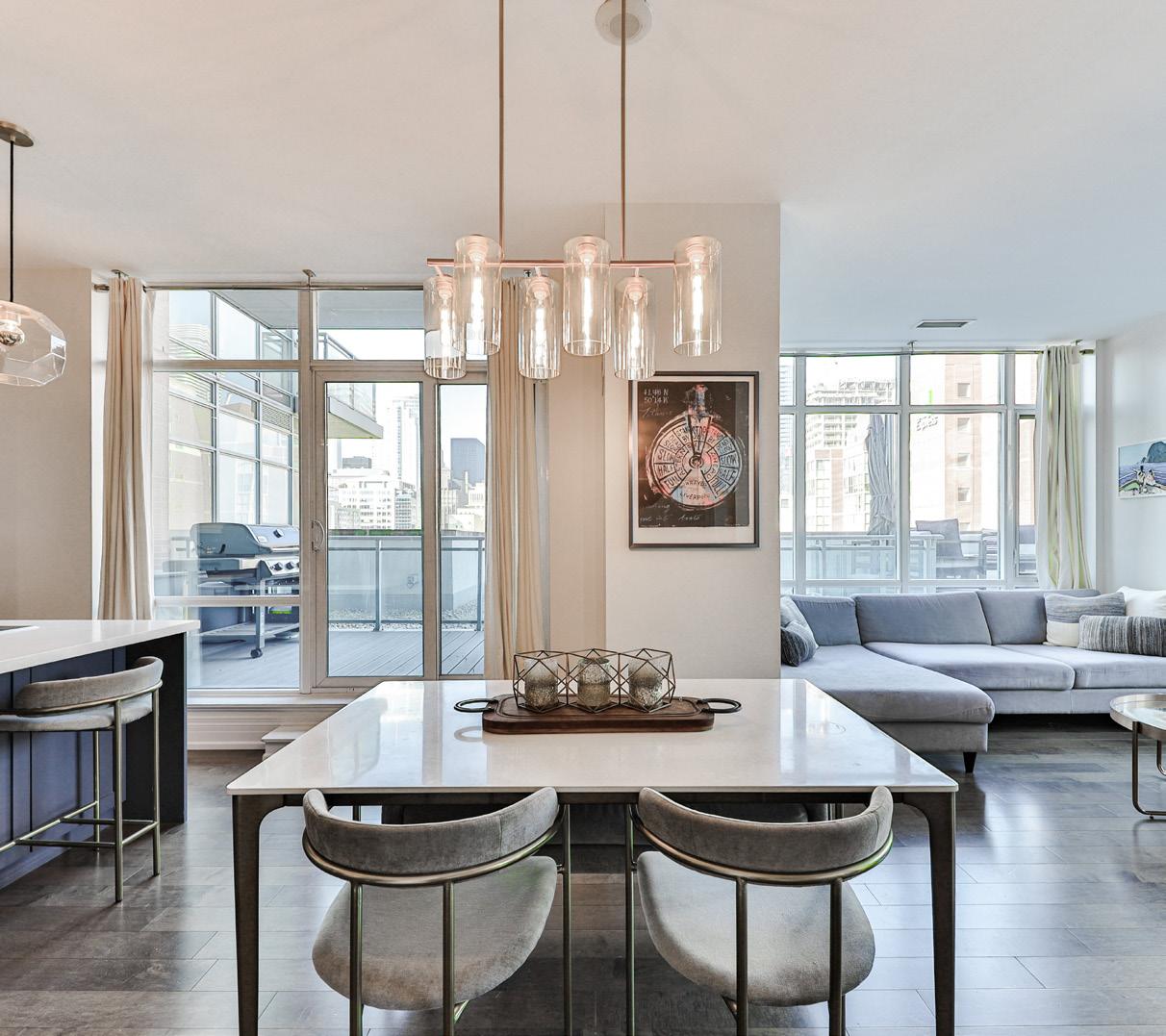A large quartz island with barstool seating serves as a stunning focal point, perfect for casual dining or entertaining. The farmhouse sink, pendant lighting, and pot lights enhance the kitchen’s sophisticated design, while in-wall speakers add to the ambiance. A sliding door provides seamless access to the expansive private terrace, allowing for easy indoor-outdoor dining and entertaining.