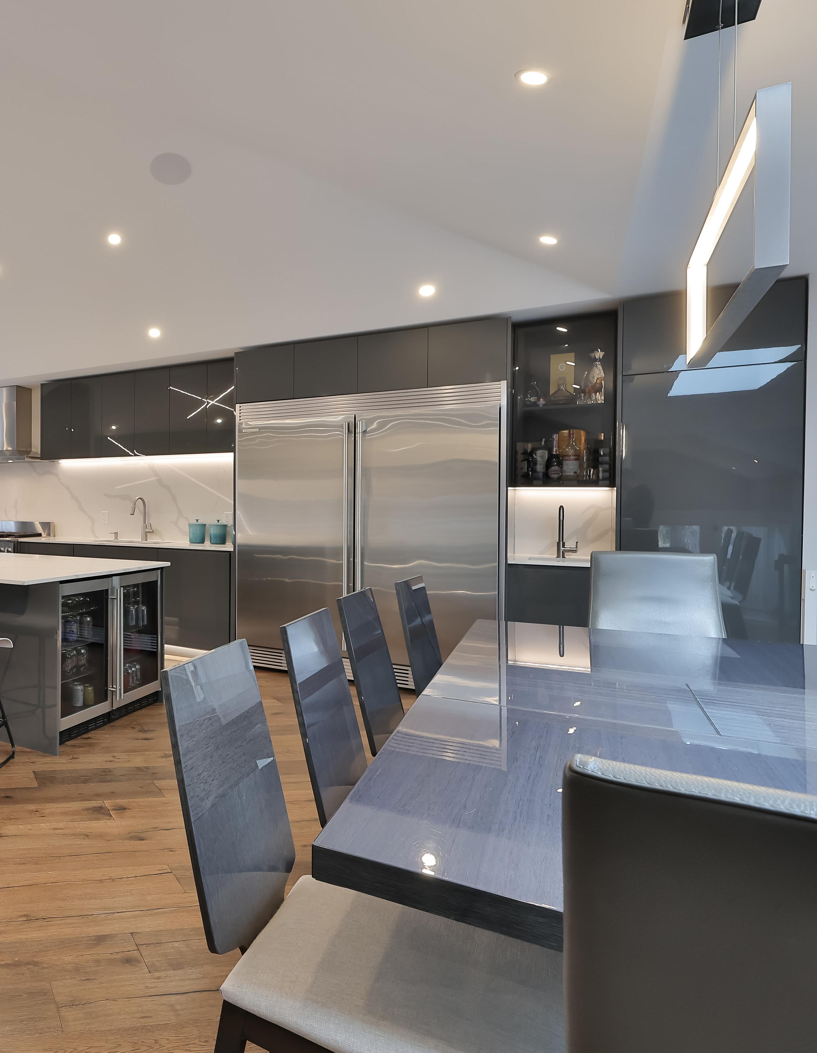 The single stainless steel undermount sink, complete with a water filtration system, offers convenience, while a custom built-in undermount bar sink with quartz countertops and glass inserts adds a touch of sophistication. Illuminated by a light-up pantry with pull-out drawers, finding ingredients has never been easier, while built-in Sonos ceiling speakers provide the perfect soundtrack to culinary adventures.