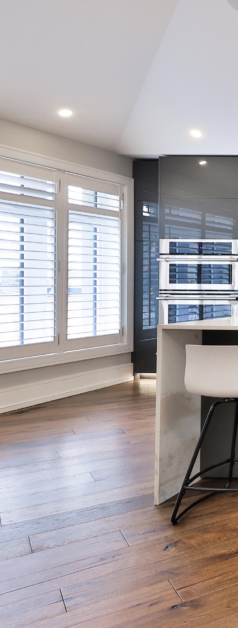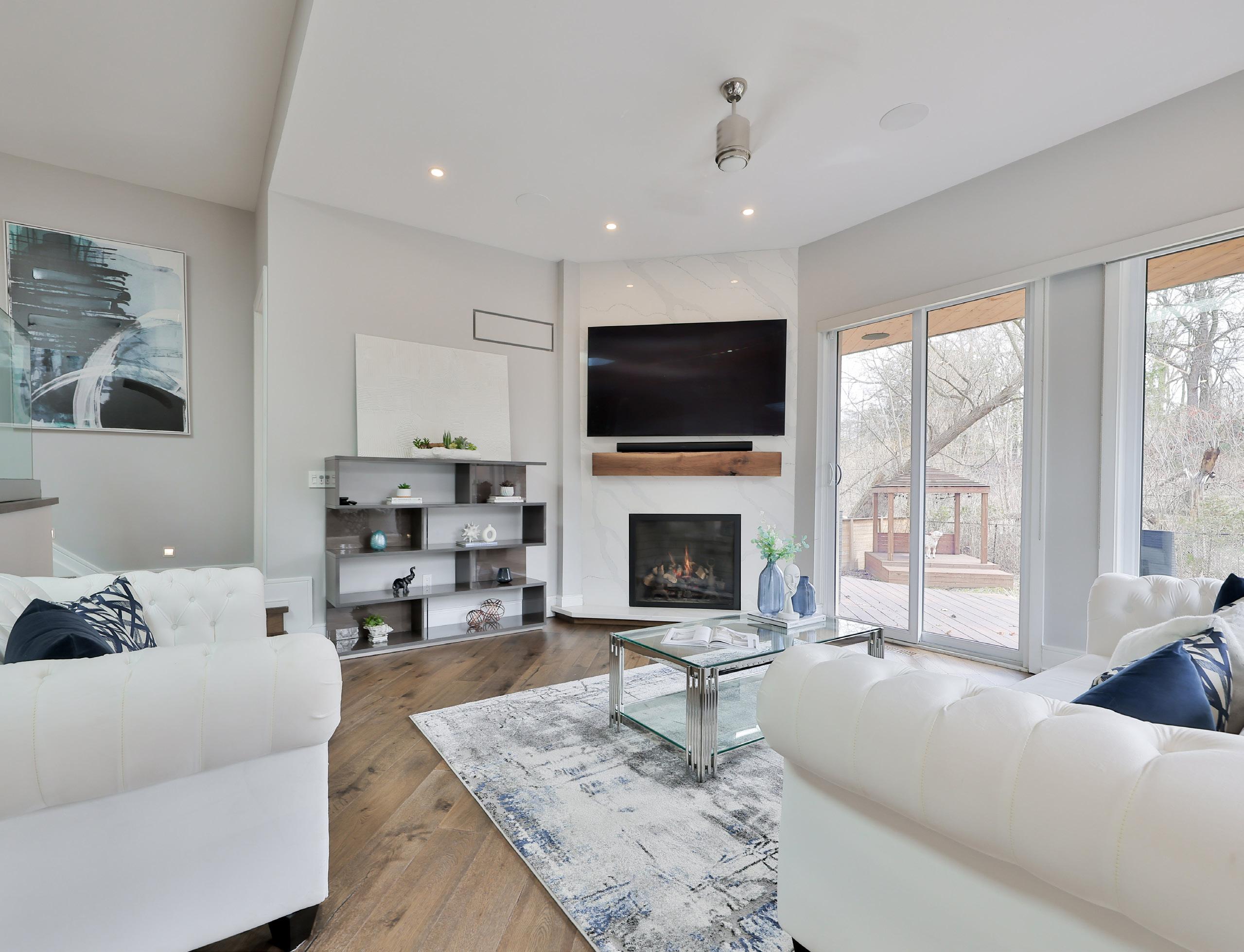 In the family room elegance and comfort intertwine to craft a space that radiates luxury and coziness. A custom floorto-ceiling quartz feature wall, adorned with a sleek gas fireplace, commands attention, serving as both a focal point and a source of warmth. The room boasts a spacious, airy feel thanks to its soaring 2-storey vaulted ceiling, while pot lights and a ceiling fan provide both style and functionality. Two sliding door walk-outs seamlessly connect the indoors with the outdoors, allowing natural light to flood the space and offering an invitation to create cherished memories.