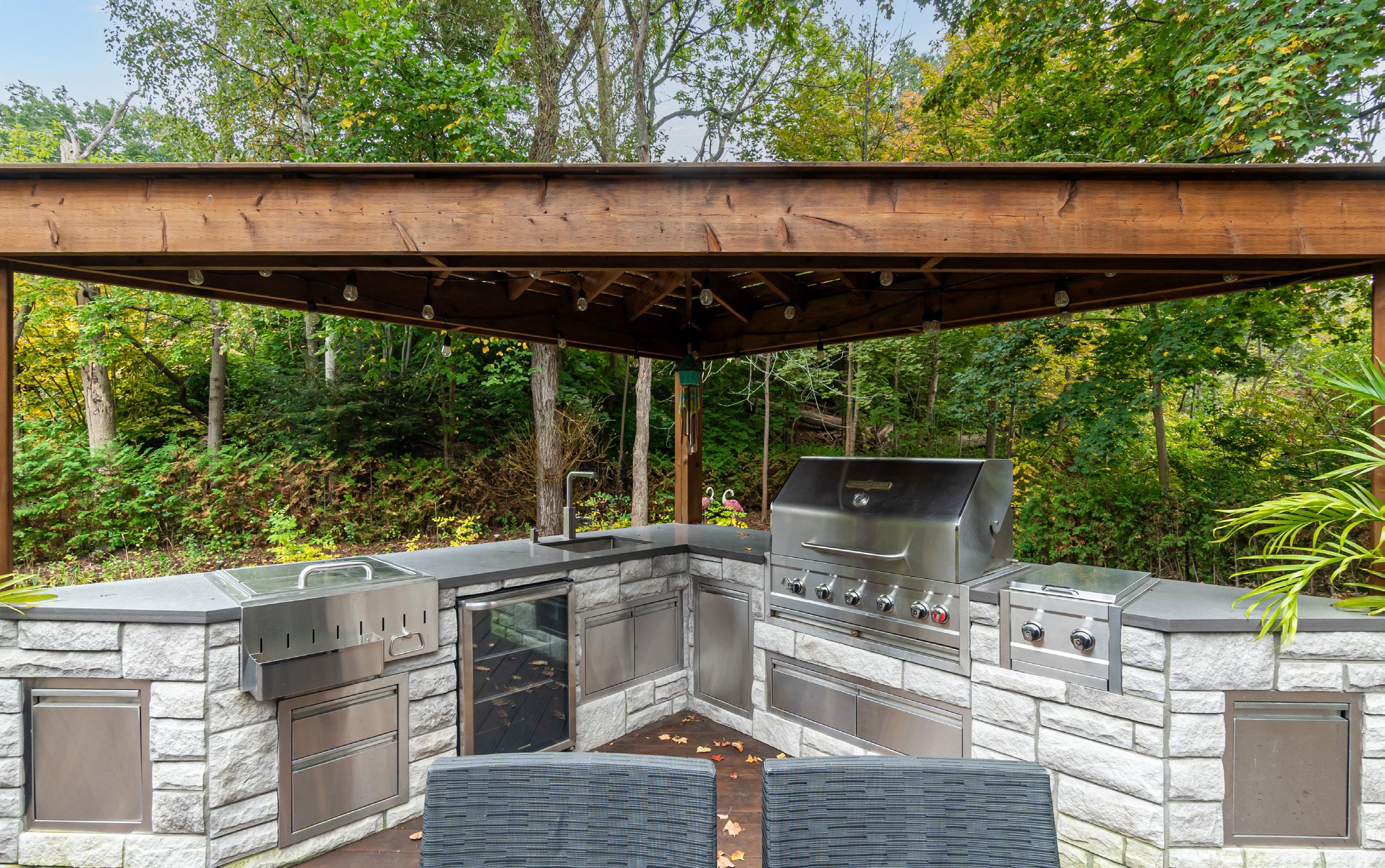 Indulge your culinary passions in the custom-built outdoor kitchen, featuring a Crown Verity 5-burner barbecue with a double side burner, reminiscent of a commercial-grade setup, ensuring that every outdoor meal is a culinary masterpiece. With the soothing sounds of nature as your backdrop, dining al fresco has never been more exquisite.