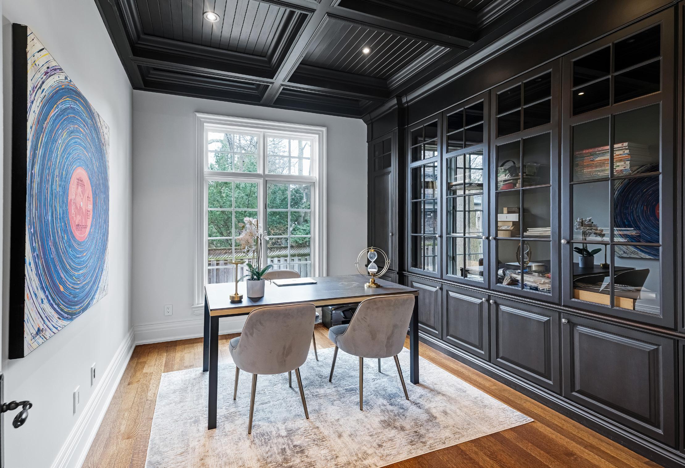 and tile surround. Hardwood flooring found throughout adds an air of elegance, while builtin wall speakers provide the perfect ambiance for entertaining guests. Adjacent to the living room, the formal dining room exudes timeless charm with its vaulted ceiling and offering seamless access to the walk-through servery. Continuing your journey through the main level, you’ll discover a family room adorned with a gas fireplace and custom built-ins, creating an inviting atmosphere for relaxation. The adjacent eat-in kitchen is a culinary haven, featuring quartz countertops, and a granite center island. Completing the main level is an impeccably appointed office space, replete with custom-built cabinetry and wood-panelled waffled ceiling, offering the perfect retreat for work or study.