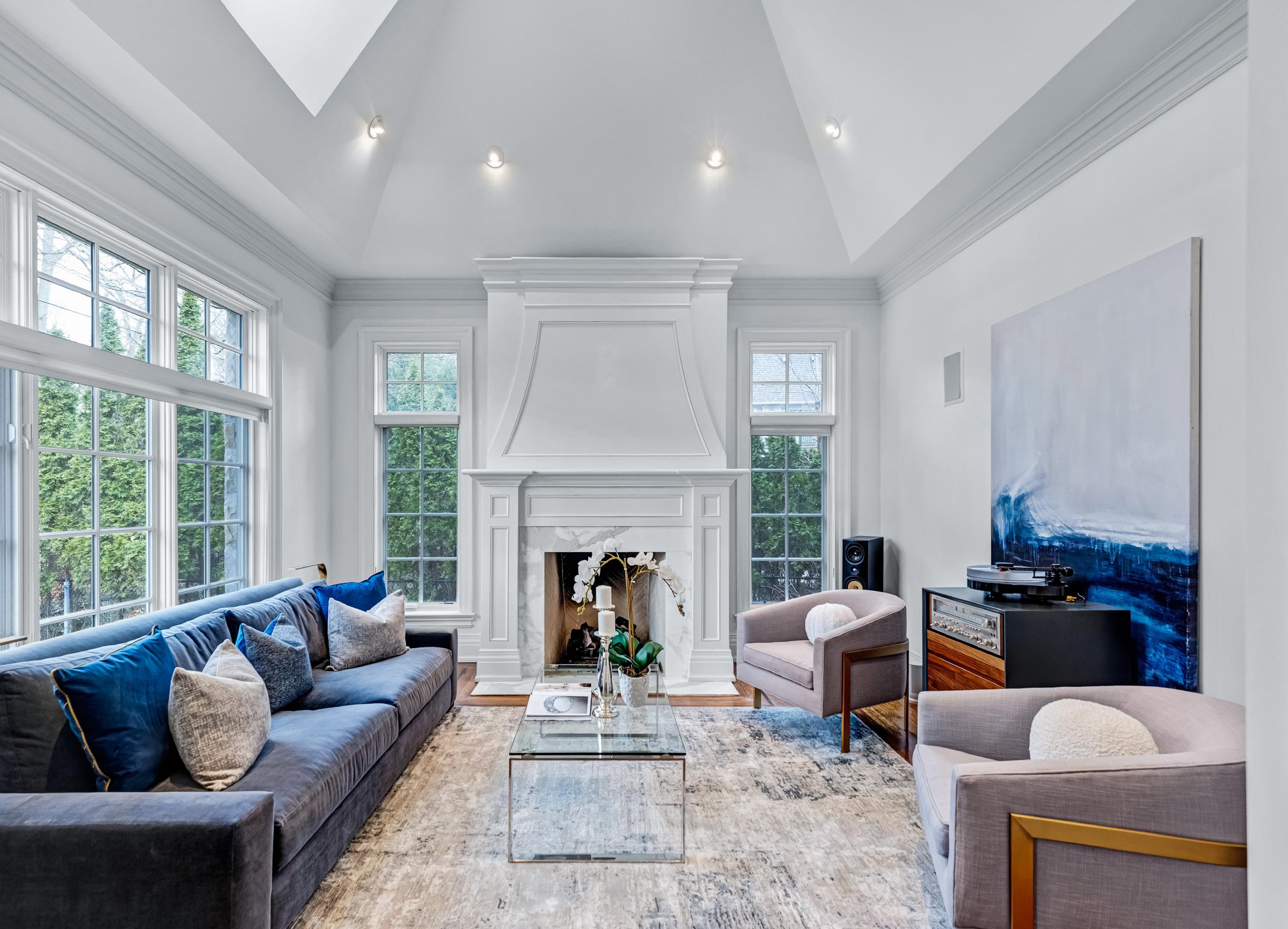 Step into the formal living room, where a symphony of opulence unfolds. An open flame gas fireplace, adorned with a custom mantle and tile surround, becomes the focal point, casting a warm glow over the room. Built-in wall speakers provide immersive audio, while crown molding and vaulted ceilings add architectural intrigue. Illuminated by an array of pot lights, the hardwood flooring gleams underfoot, inviting guests to gather and converse in this refined setting. The formal dining room exudes an air of sophistication and charm with vaulted ceilings and custom millwork creating an atmosphere of grandeur, while wall-mounted light fixtures and pot lights provide ambient illumination. Effortlessly host lavish dinner parties with access to the walk-through servery.