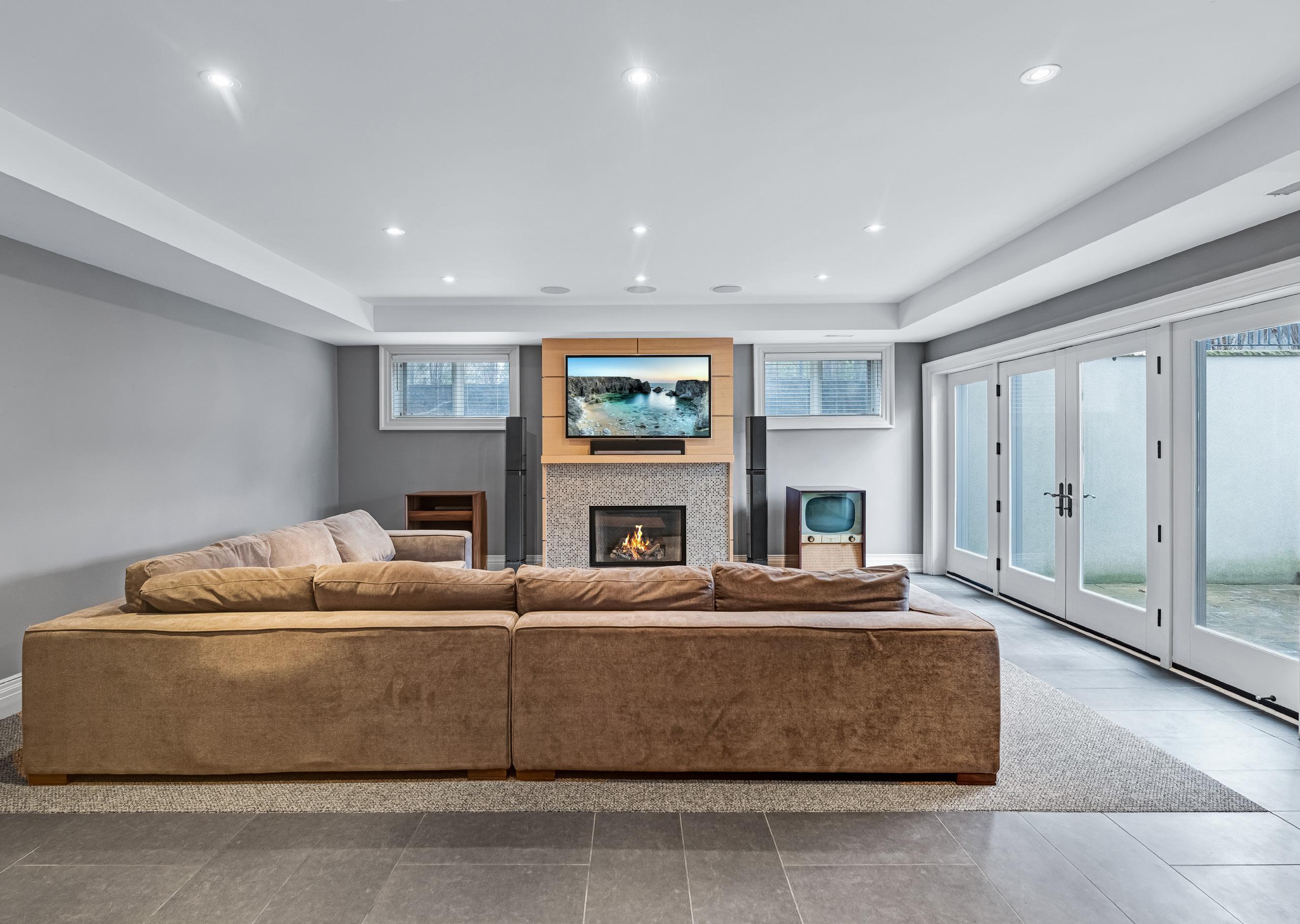 Descend into the lower level and enter a realm of opulent entertainment and relaxation. As you step onto the radiant heated tile flooring of the staircase and landing, you’re greeted by a sense of warmth and sophistication. Venture further into the lower family room, where a gas fireplace with a mosaic tile surround becomes the centerpiece, offering a cozy ambiance for gatherings. With a walk-up to the backyard via double doors, this space seamlessly connects indoor and outdoor living, providing a perfect setting for leisure and entertainment.