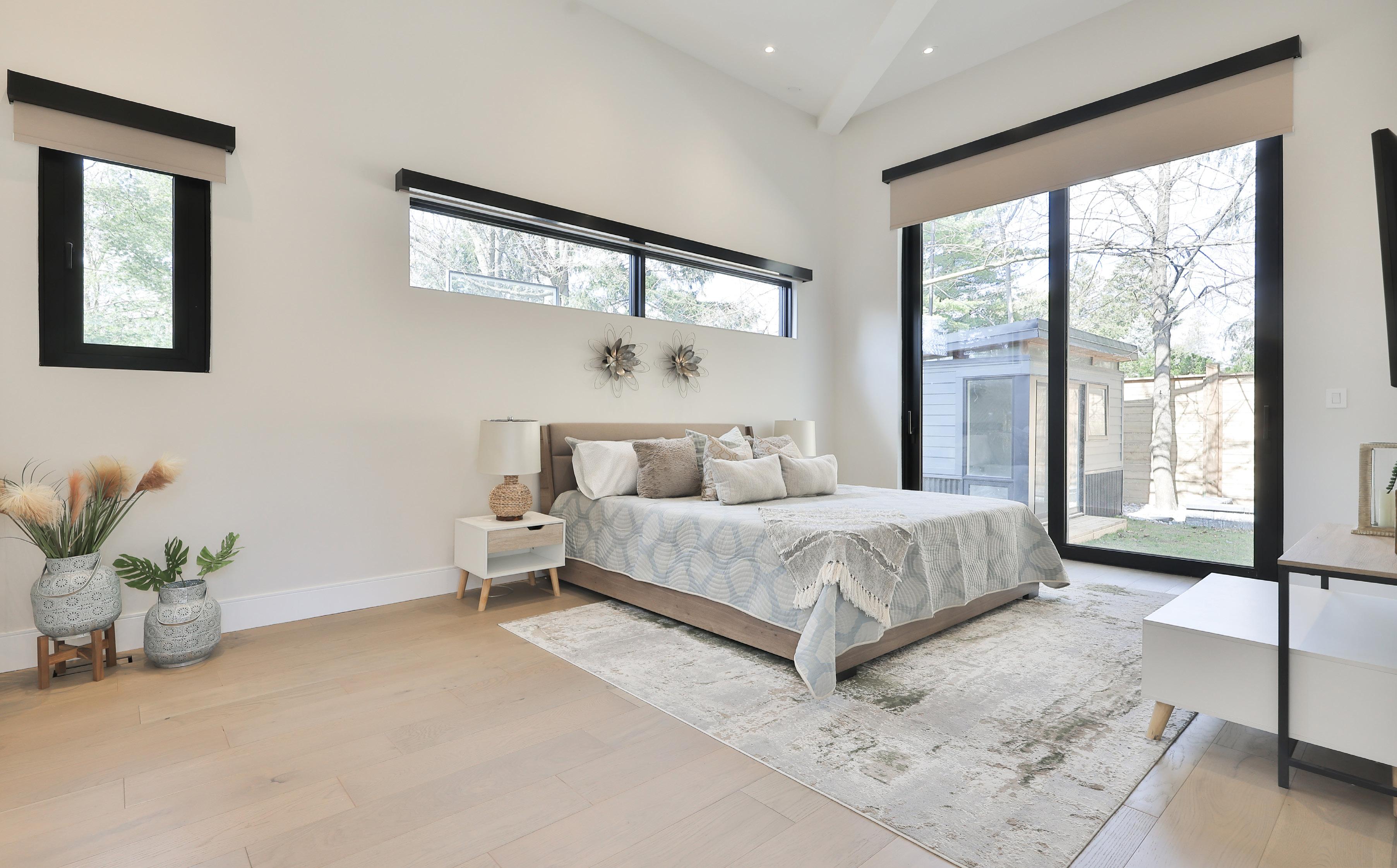 The living room and dining room merge seamlessly into an expansive open-concept space, creating an atmosphere of sophistication and warmth. Sunlight dances through the sliding doors, offering breathtaking views of the pool and infusing the room with a serene ambiance. Full-height wall-to-wall custom maple cabinetry adorns the walls, providing both storage and a striking focal point, while built-in ceiling speakers ensure a harmonious soundtrack to every gathering. Motorized blinds offer privacy and shade at the touch of a button, while pot lights and wide-plank hardwood floors underfoot add a touch of elegance to the space.