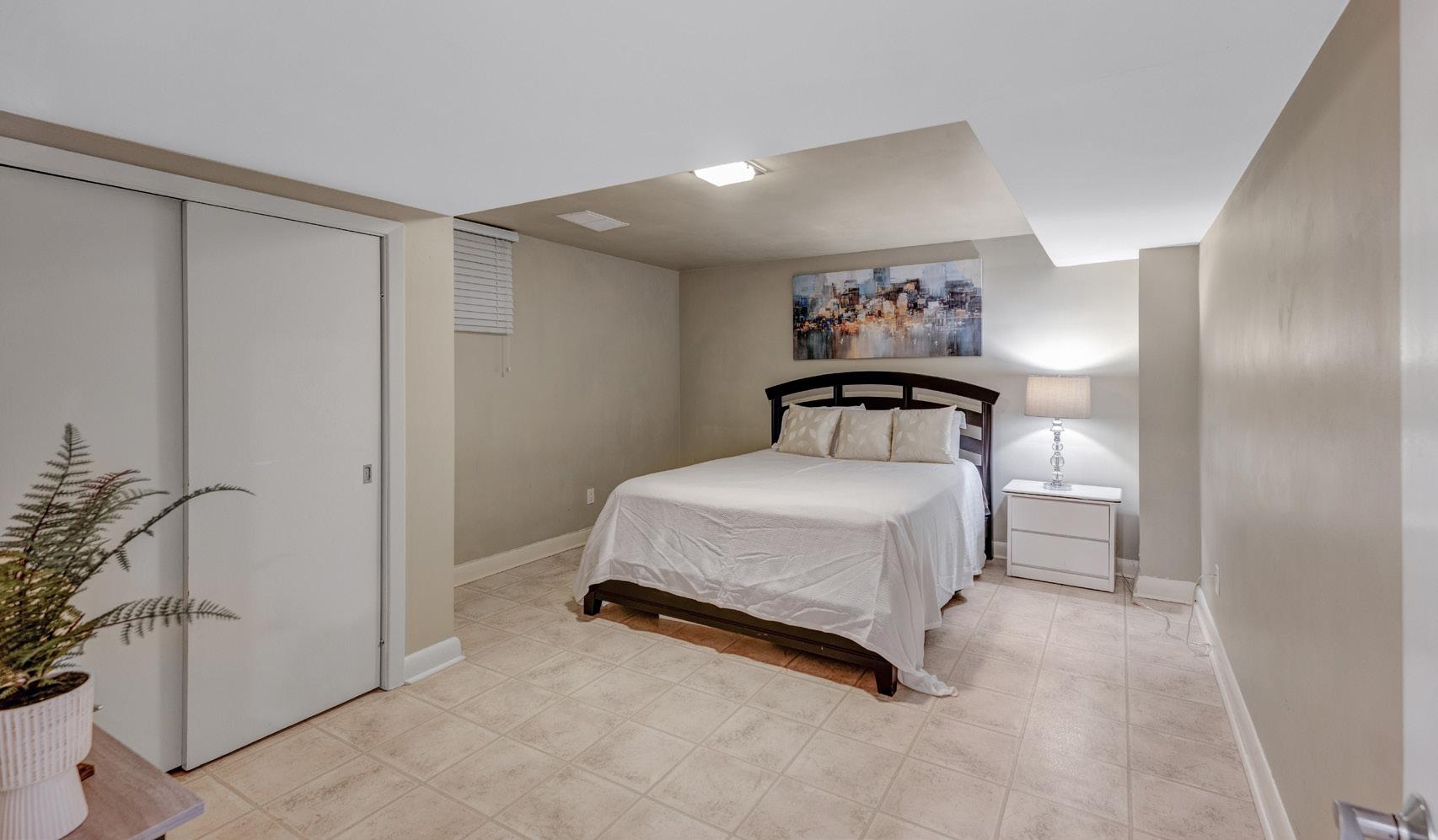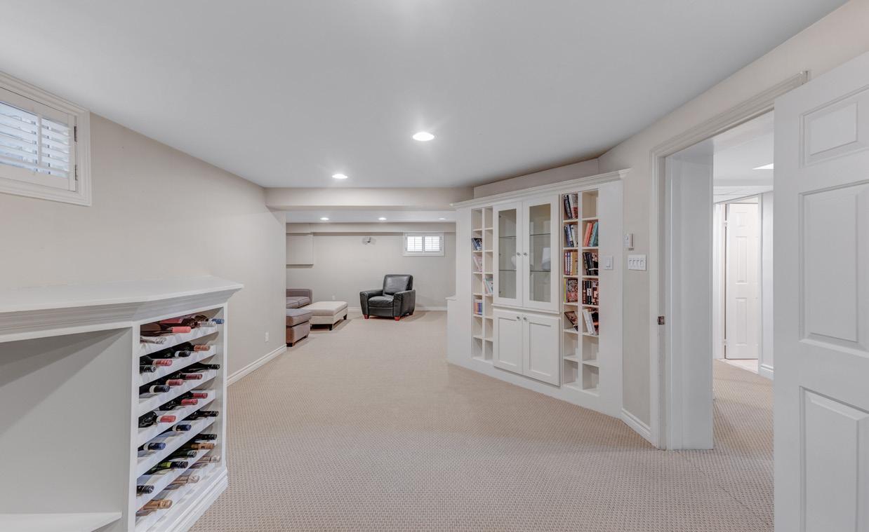 A dedicated games room includes a wine rack, sink, and custom shelving, making it ideal for casual gatherings or a home bar. The fourth bedroom is bright and private, with an above-grade window, vinyl flooring, and closet space.