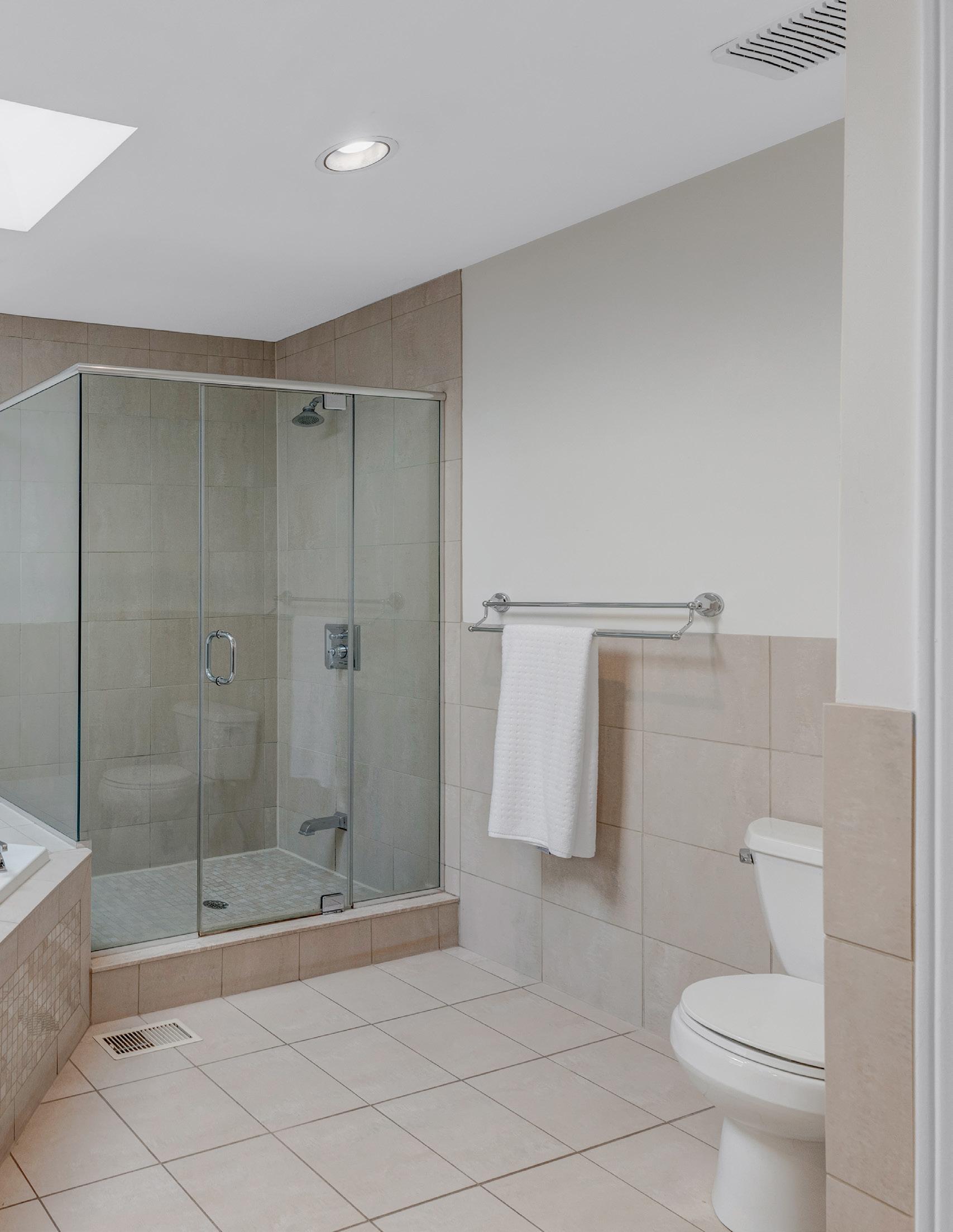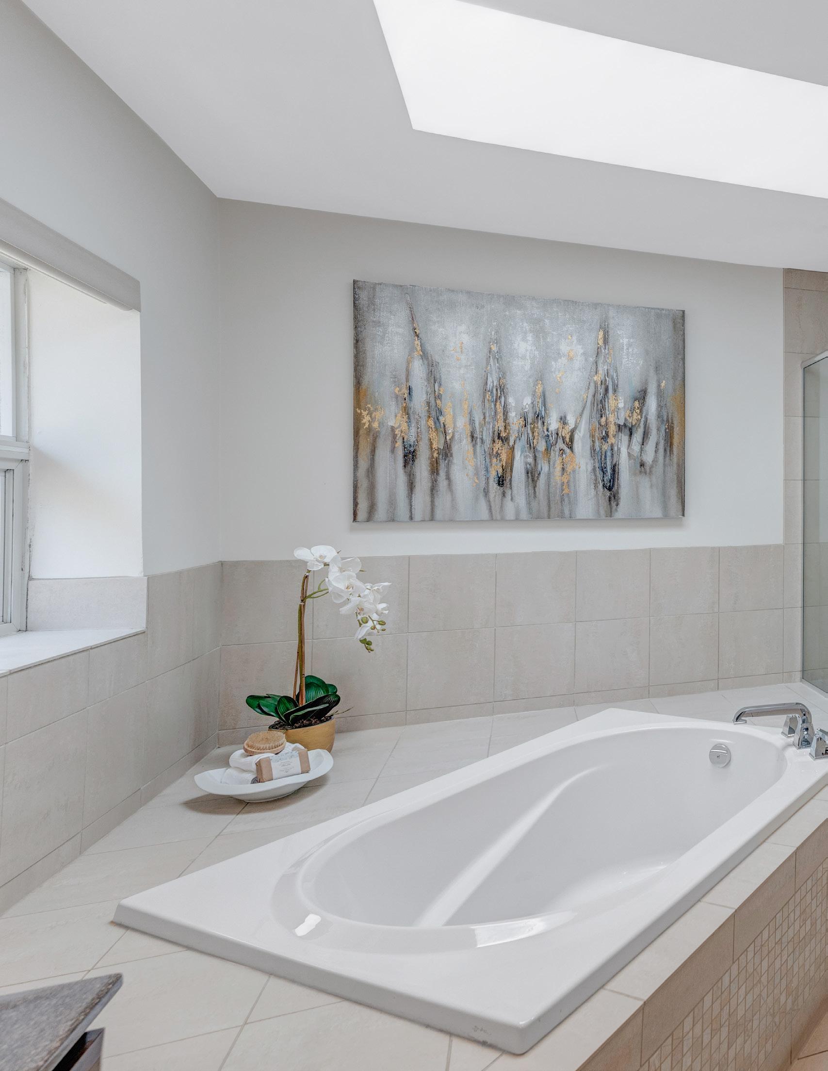 The luxurious 5-piece ensuite is beautifully appointed with herringbone tile wainscoting, a skylight, and a spa-like deep soaker tub. Additional features include a glass walk-in shower, double vanity with Corian countertops, a linen closet, and modern fixtures, creating a serene and functional space designed for relaxation.