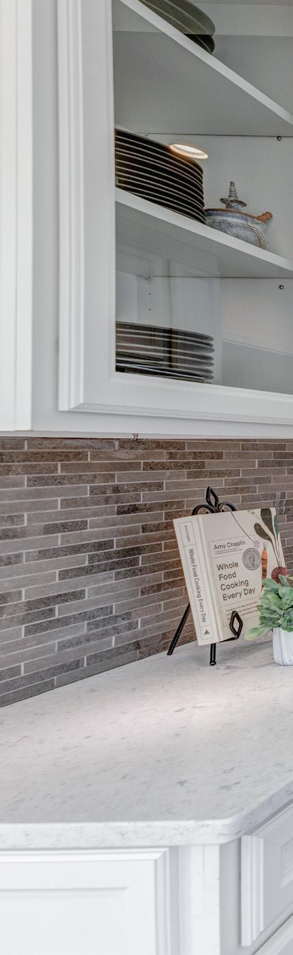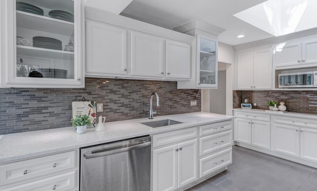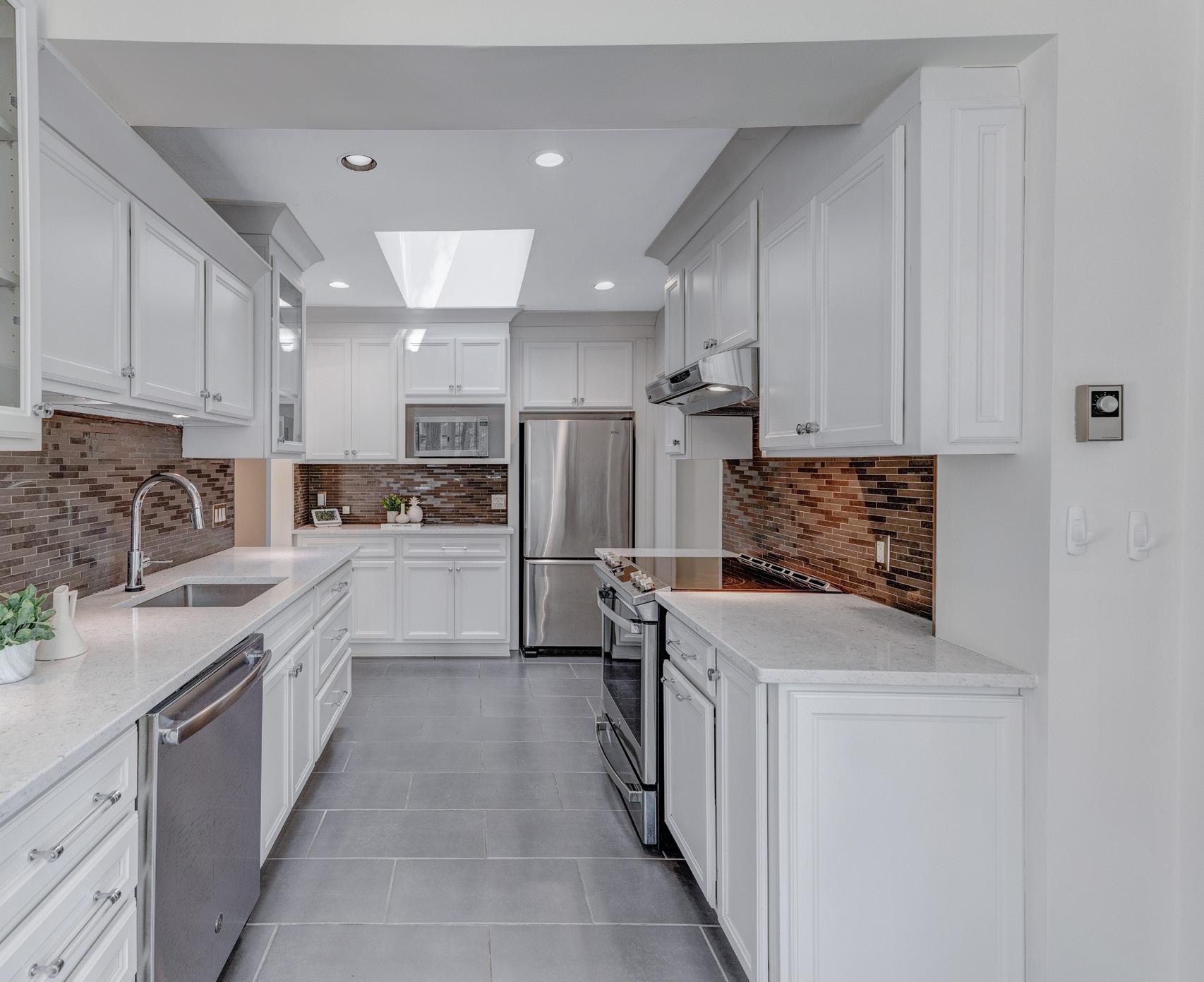 The custom Muti kitchen is designed with the avid home chef in mind, featuring Caesarstone countertops, a tile backsplash, and abundant custom built-in cabinetry with soft-close drawers and undermount lighting. The space is bright and airy thanks to a skylight, pot lights, and windows overlooking the lush backyard.