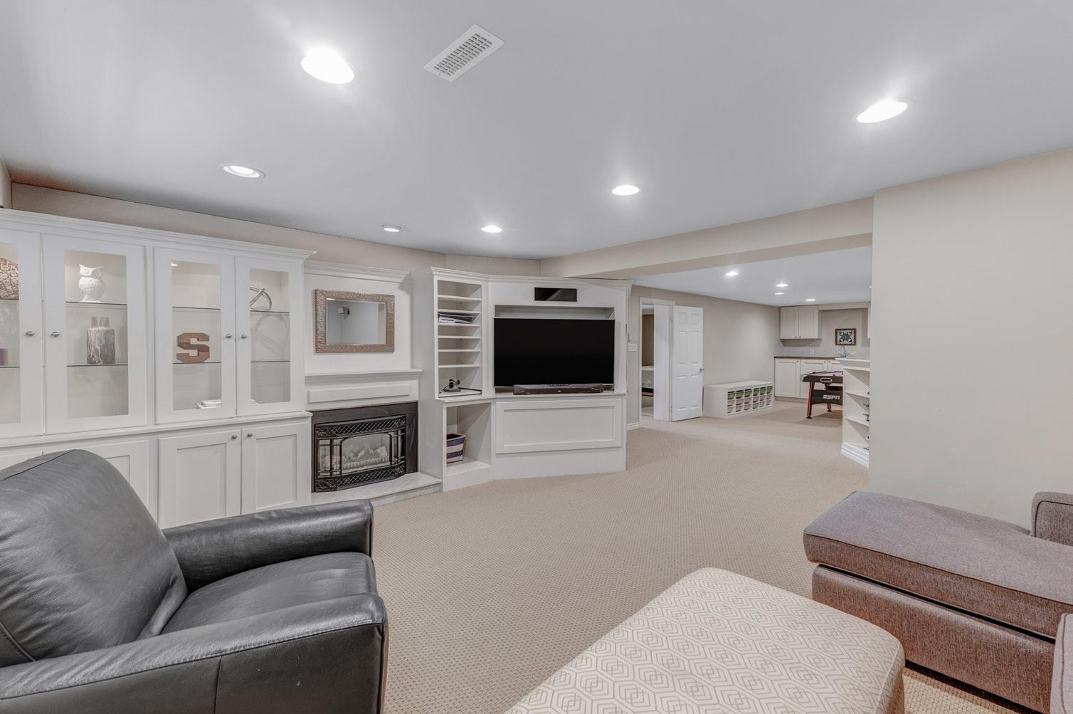 The fully finished lower level walk-up is designed for versatility and multi-functional living. The family room features an above-grade window, a gas fireplace with a built-in entertainment unit, and pot lights, offering a cozy space for relaxation or movie nights. Built-in speakers elevate the entertainment experience.
