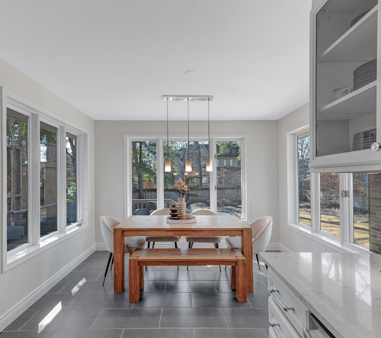 A lounge area, open to the kitchen and living room, is perfect for casual gatherings, offering hardwood flooring, crown moulding, and a walkout to the backyard deck. The dining room is flooded with natural light from three expansive windows, and its walkout to the deck makes it ideal for both formal dinners and casual family meals.