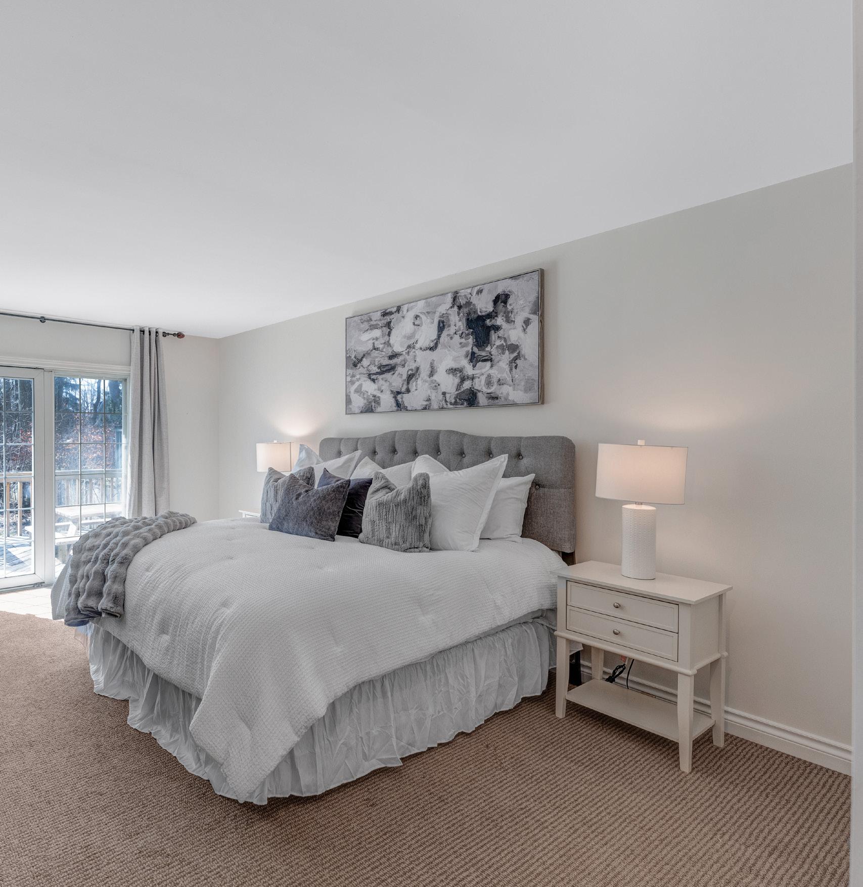 The spacious primary bedroom offers a peaceful retreat, featuring broadloom flooring, a walk-in closet with custom builtin organizers, and a walkout to the backyard deck, perfect for enjoying morning coffee or unwinding in the evening.