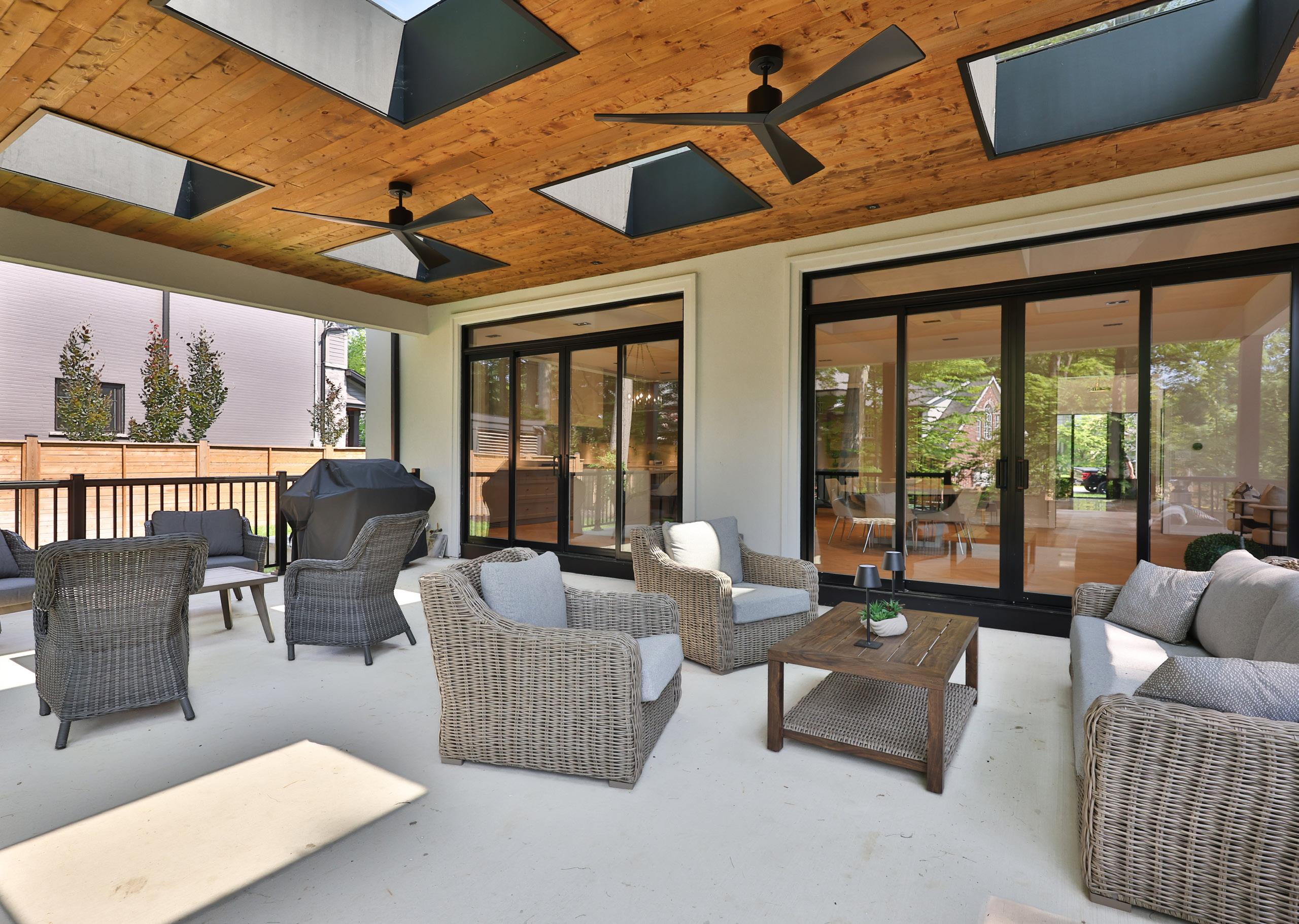 An exquisite blend of elegance, privacy, and endless potential, the backyard at 1380 Birchwood Heights Drive offers a rare opportunity to create a truly personalized outdoor retreat. Step out from the kitchen to a beautifully covered porch, thoughtfully designed to blur the line between indoor sophistication and outdoor serenity. This expansive space is enhanced by six custom skylights that flood the area with natural light, while two matte black three-blade fans by Visual Comfort provide a sleek, modern edge. Outfitted with pot lights, a gas line for barbecue installations, and electrical access, this area is perfectly suited for stylish entertaining, casual family meals, or tranquil morning coffee amidst the trees.