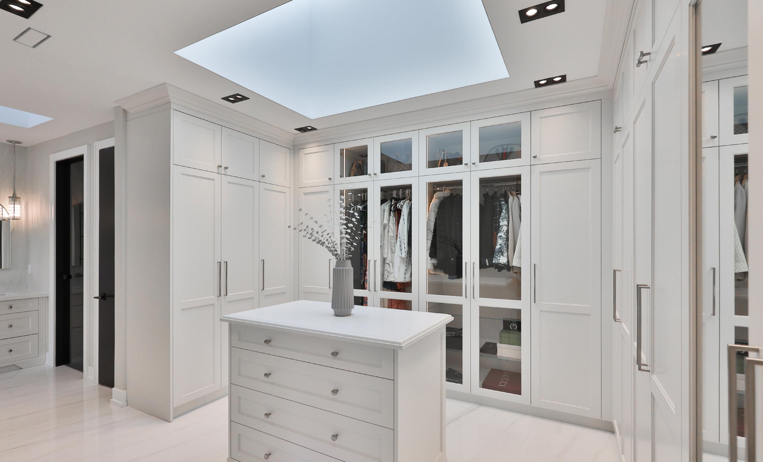Step beyond the sleeping quarters into a walk-in closet that rivals a high-end boutique, meticulously curated with floor-to-ceiling, wall-to-wall custom cabinetry. Mirrored and glass-insert doors are elegantly backlit with LED accent lighting, creating a radiant glow that highlights every detail. A custom five-drawer vanity with a dedicated jewellery display offers a glamorous touch, while the generous layout provides ample storage for formalwear, handbags, and designer footwear. An oversized skylight pours natural light into the space, illuminating the closet’s thoughtful design. Heated tile flooring underfoot completes this dressing experience with indulgent comfort.