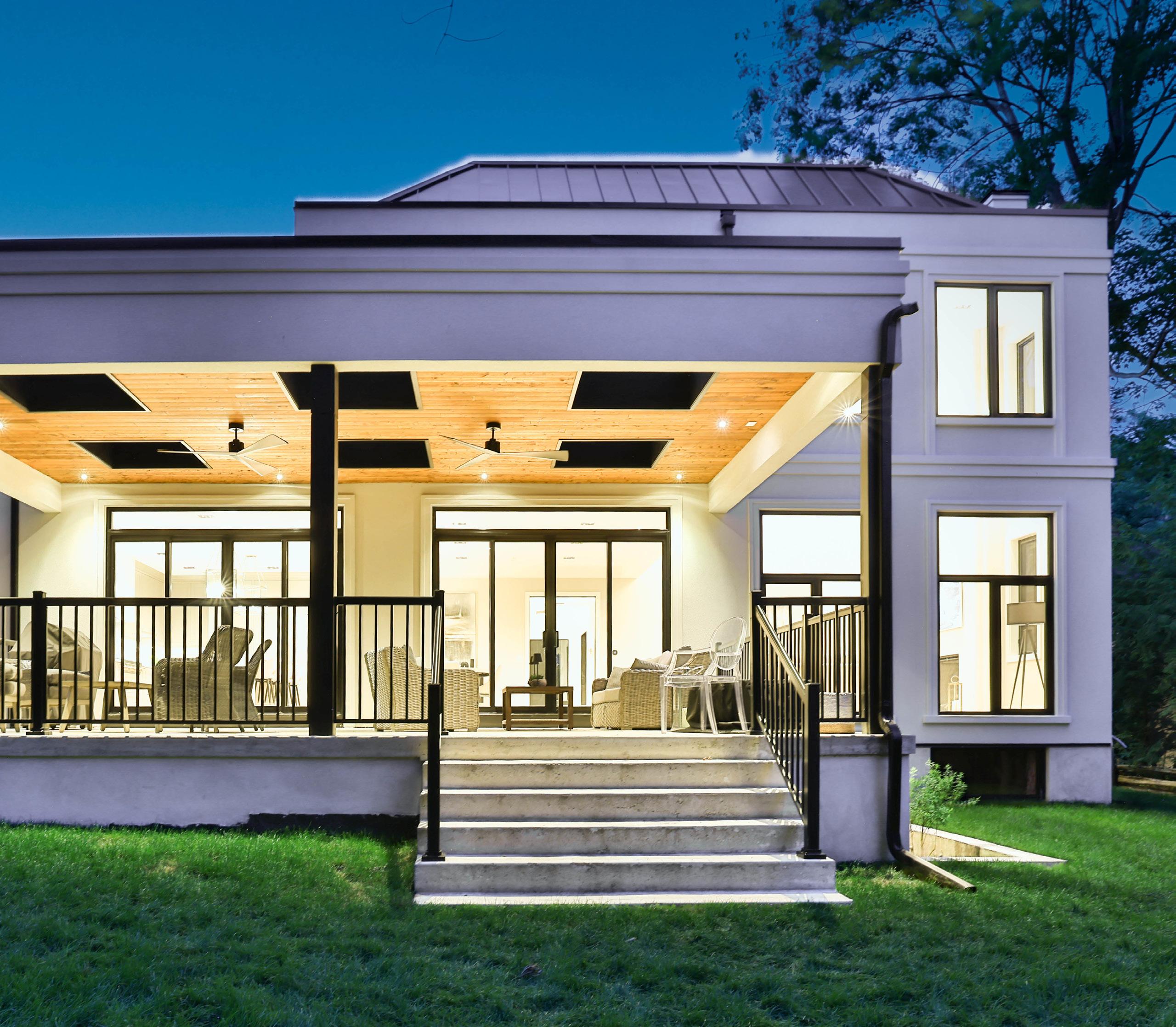 A luxurious retreat of exceptional design and refined elegance, the primary bedroom is a sanctuary tailored for those who appreciate the finer things in life. A harmonious blend of comfort and elegance, the space is enriched by custom millwork, ambient pot lighting, and a modern black-and-white semi-flush mount fixture from Hinkley’s Graham Collection. Wide-plank white oak flooring, laid in an exquisite herringbone pattern with custom flush-mount vents, adds warmth and texture, while a walk-out to a private deck invites tranquil morning coffees and serene evening reflections beneath the open sky.