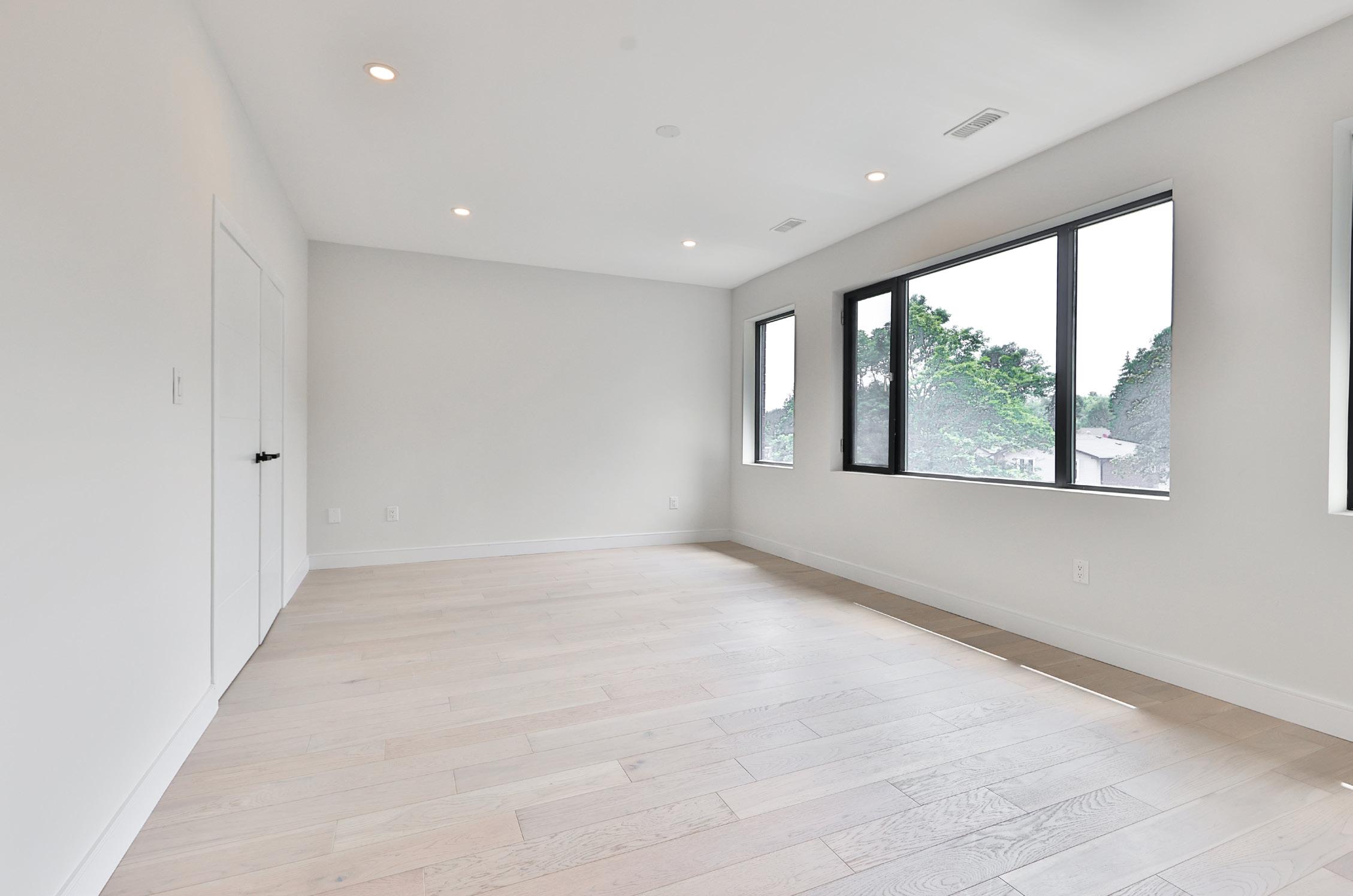 Behold the epitome of elegance and comfort in the primary bedroom. Adorned with engineered wide plank white oak flooring, this regal retreat boasts a large window that offers enchanting vistas of the serene backyard, infusing the space with a sense of tranquility. Pot lights delicately grace the ceiling, creating a warm and inviting ambiance.