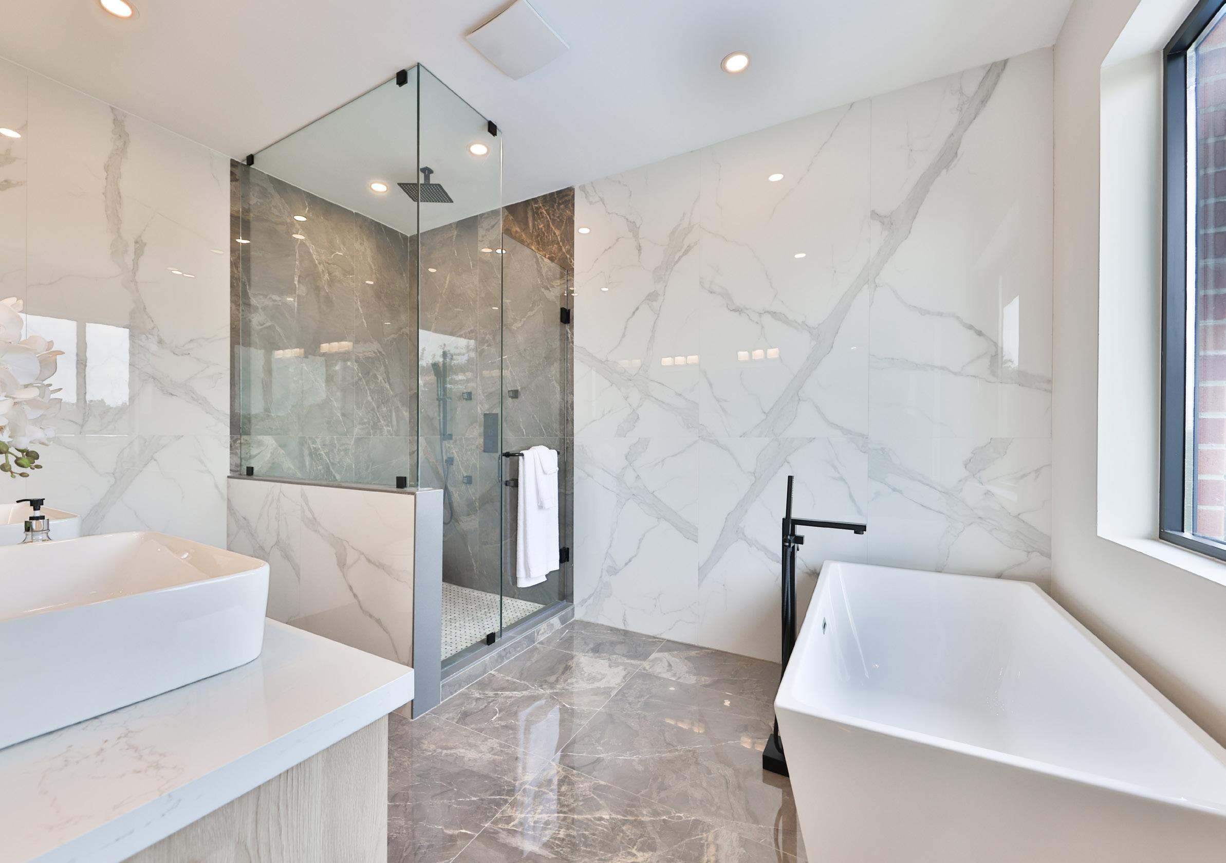 Indulge in pure luxury within the 5-piece ensuite boasting a built-in double sink floating vanity with quartz countertops and undermount cabinetry, offering both elegance and practicality. The walk-in glass shower promises a rejuvenating experience with its porcelain tile bench and surround, rainfall shower head, detachable shower head, and four built-in wall body sprayers. Relax in the freestanding deep soaker tub, complemented by a floor-mounted faucet and body sprayer. The Schluter Systems Ditra-Heat digital floor thermostat and porcelain tile flooring ensure comfort underfoot.