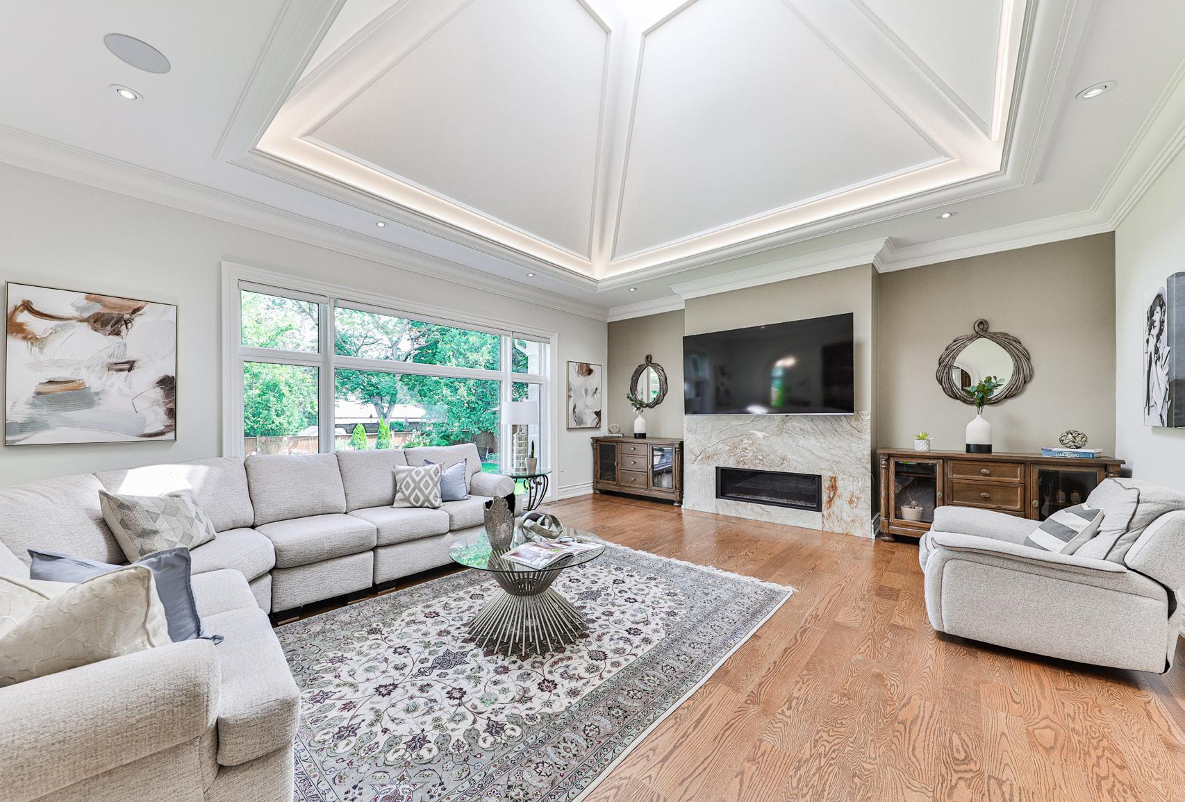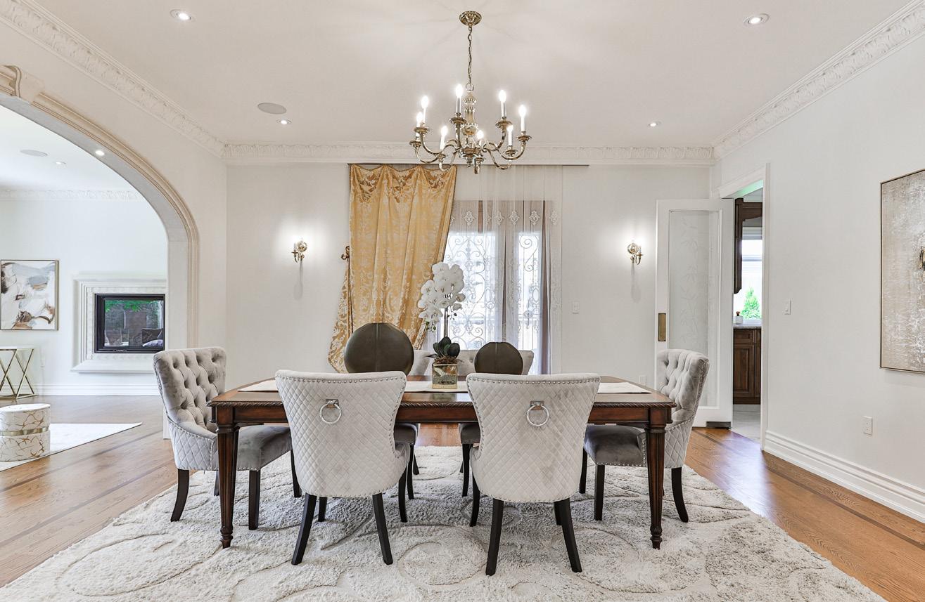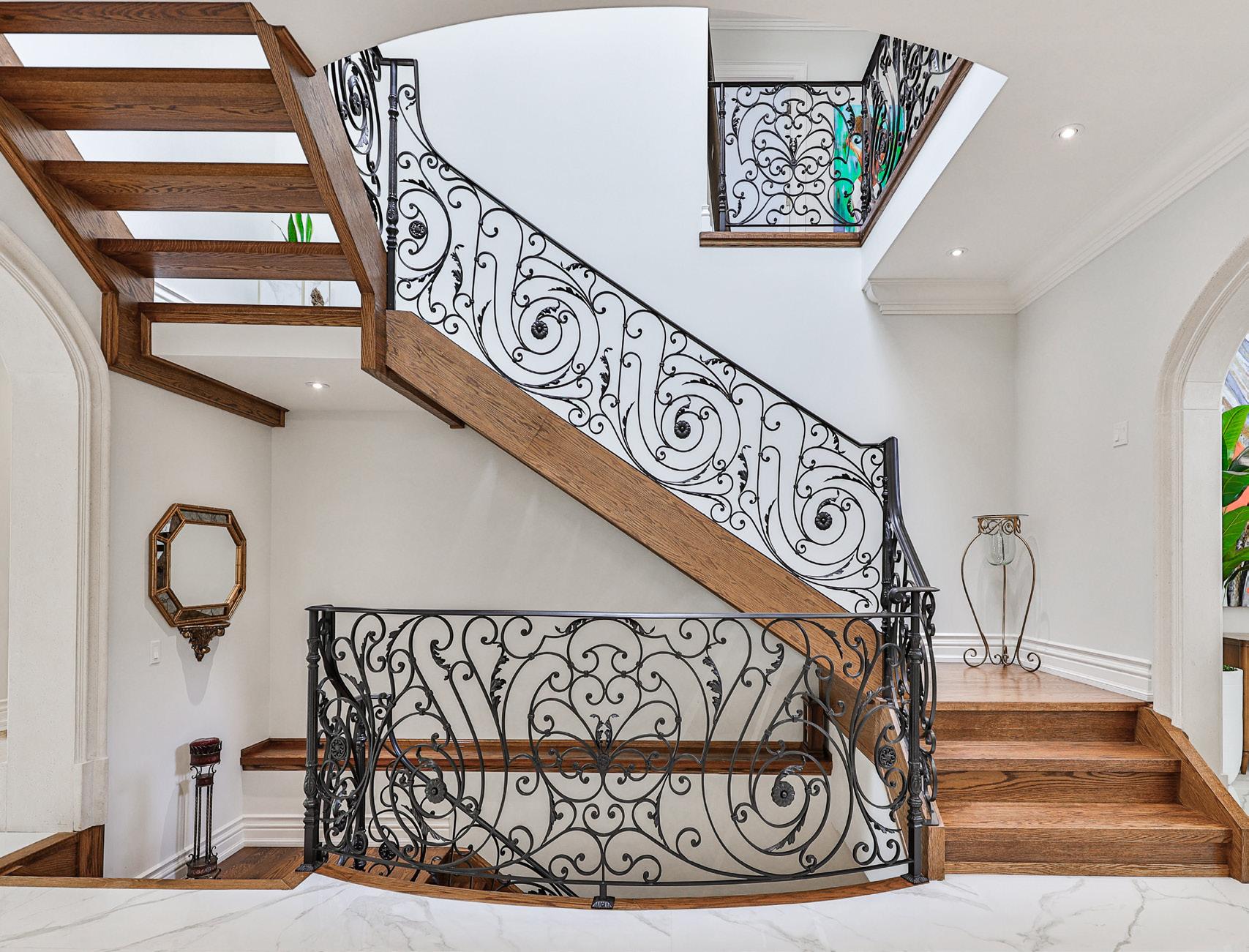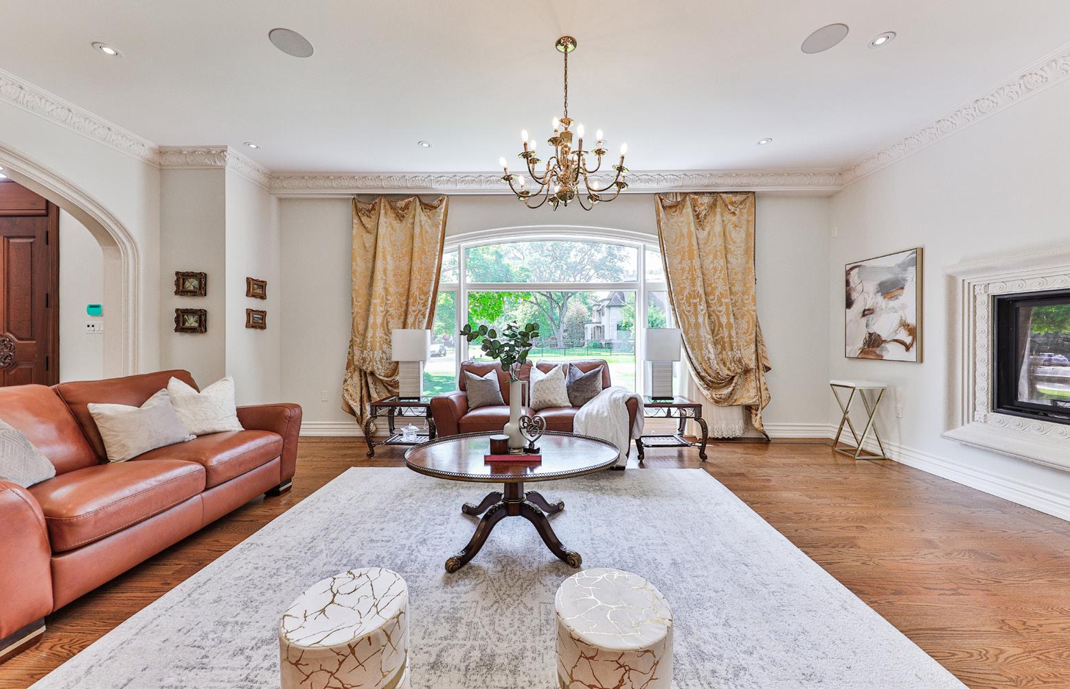 The main level was designed to impress, blending architectural elegance with functional flow. The grand foyer sets the tone with solid mahogany double doors, a limestone archway, and a two-storey ceiling crowned by a skylight and chandelier. A sweeping hardwood staircase with wrought iron railings leads to the upper level, while the foyer connects seamlessly to the formal living and dining areas.