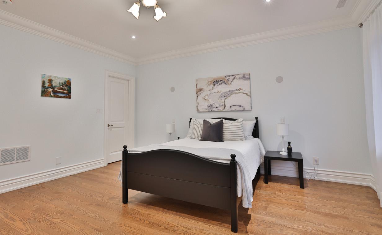 The tray ceiling, enhanced with decorative double-tiered crown moulding, is beautifully illuminated by pot lights and complemented by a chic wall-mounted light fixture. Built-in ceiling speakers and oak hardwood flooring further elevate the sense of luxury, creating an inviting ambiance that is both elegant and warm. Two expansive walk-in closets, featuring custom cabinetry, shelving, drawers, and hangers, provide ample storage, all set upon elegant porcelain tile flooring.