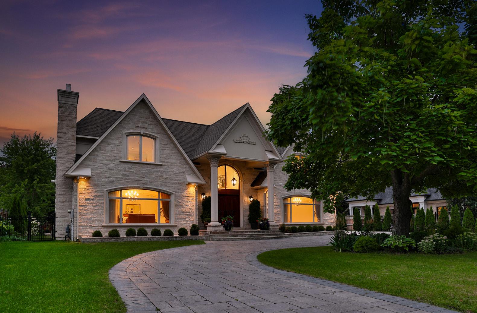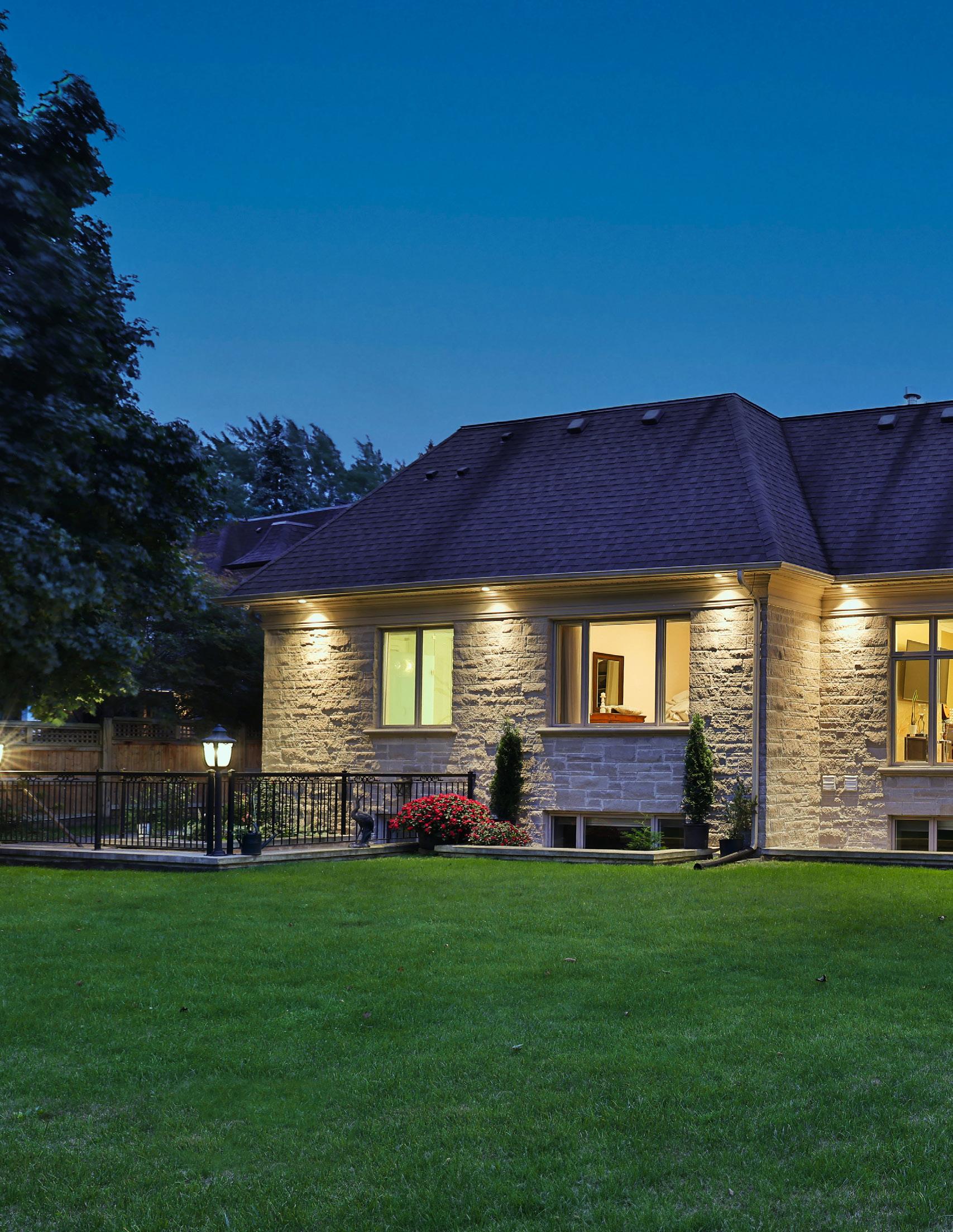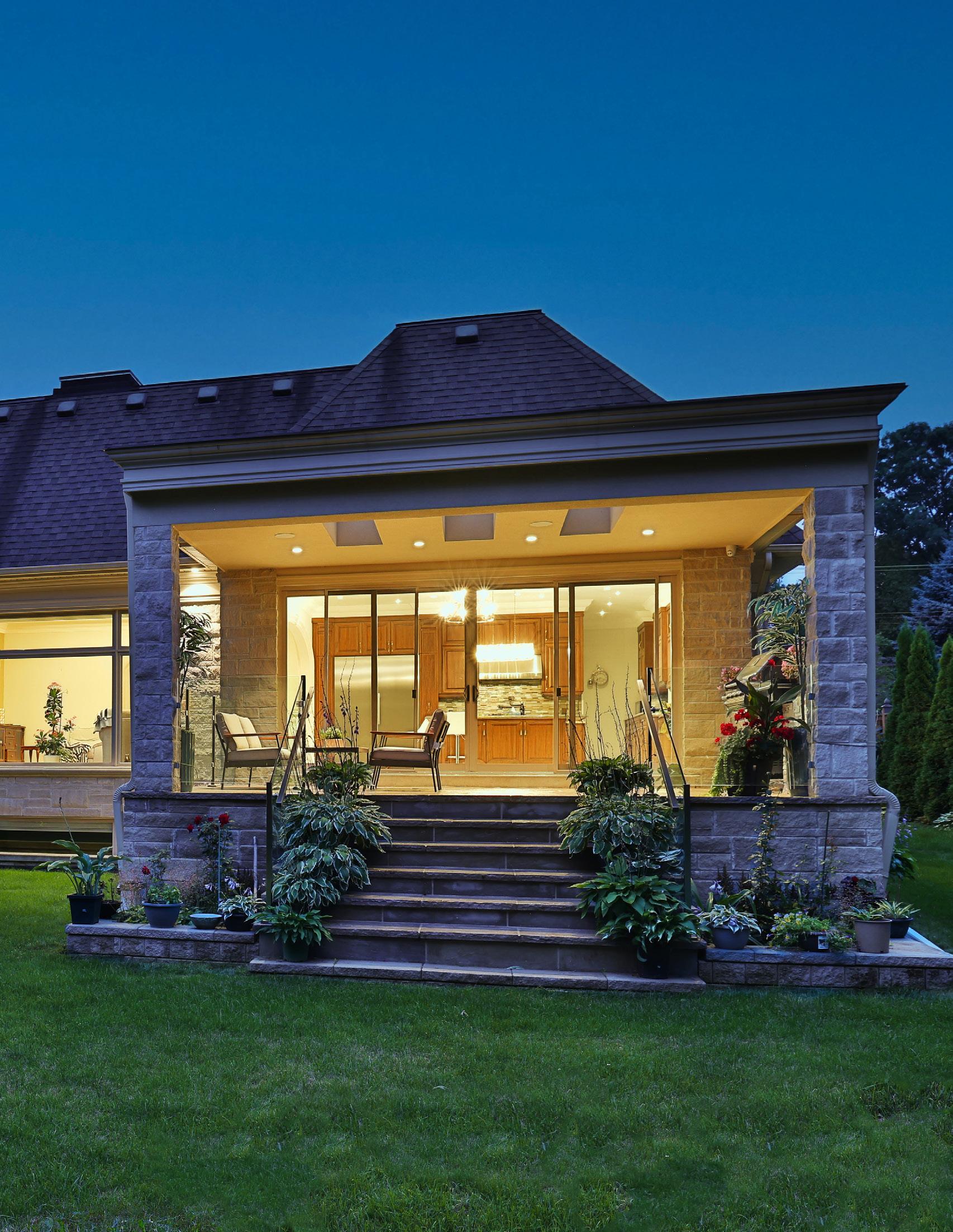 From the moment you approach, you are greeted by a beautifully landscaped front yard, featuring a grand stone-interlocked driveway with parking for 12, an inviting covered front porch, and modern exterior lighting. Step through the customdesigned solid mahogany doors into an aweinspiring foyer with a 2-storey ceiling, where a breathtaking chandelier and skylight cast a warm glow on the porcelain tile flooring and intricately designed precast limestone archways.