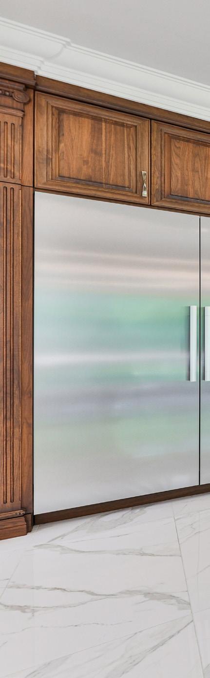 Top-of-the-line appliances elevate the kitchen’s functionality, including a Miele stainless-steel dishwasher, a Wolf 6-burner gas range with a matching stainlesssteel range hood, and a Miele stainless-steel French door refrigerator. The stainless-steel pot filler above the range offers a practical touch streamlining the cooking process.
