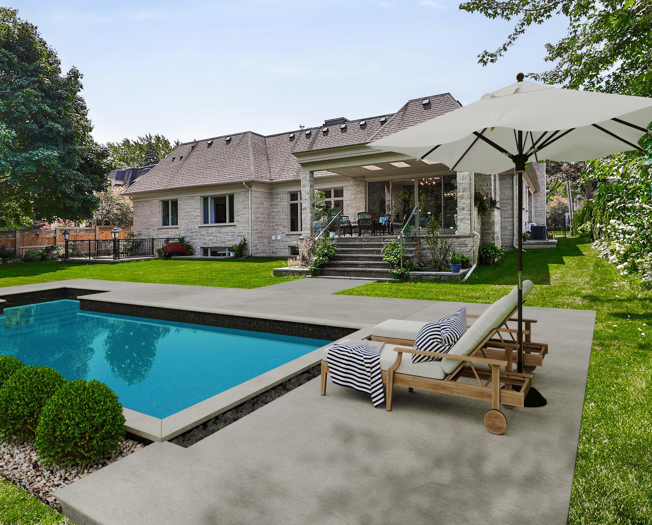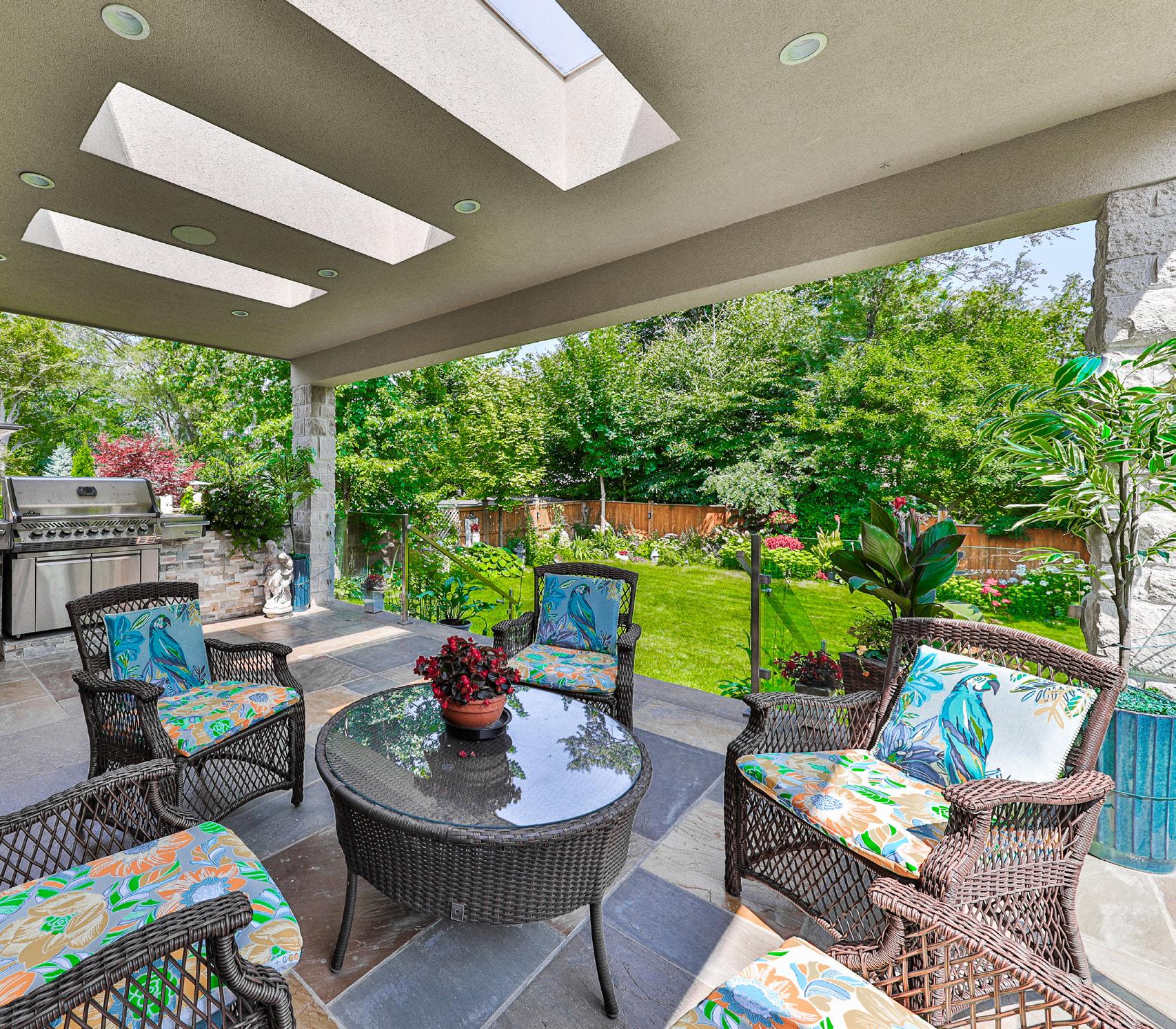 The backyard of this exquisite home epitomizes opulent outdoor living, offering a sublime retreat designed for the ultimate in relaxation and grand entertaining. An expansive covered paver patio commands attention as the centerpiece, effortlessly accessible through sliding doors from the kitchen. This outdoor sanctuary features three skylights that bathe the space in natural light, enhanced by an elegant lighting scheme with built-in speakers and pot lights, creating a captivating ambiance that shines both day and night.