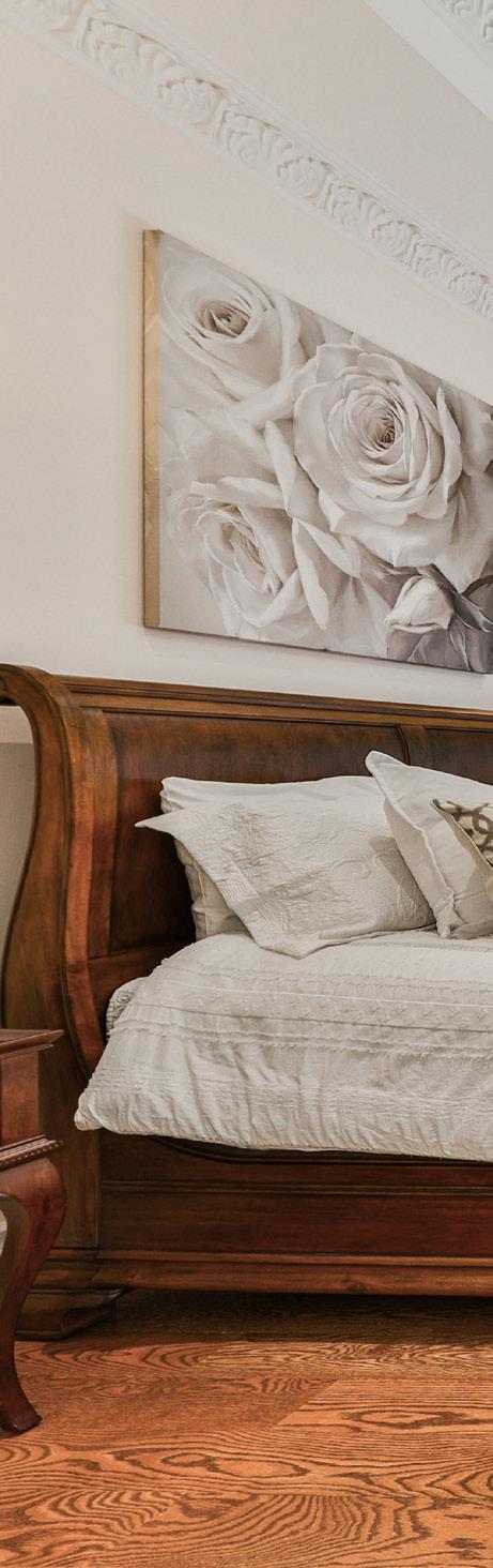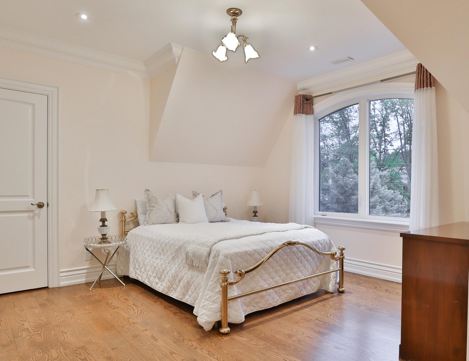 The main floor’s primary bedroom is a testament to its opulent design and ultimate comfort. Upon entering through the grand double doors, you are greeted by a serene and light-filled retreat, thanks to a striking picture window that offers tranquil views. The room is adorned with a precast decorative limestone archway, which elegantly frames the entrance and adds a touch of classic sophistication.