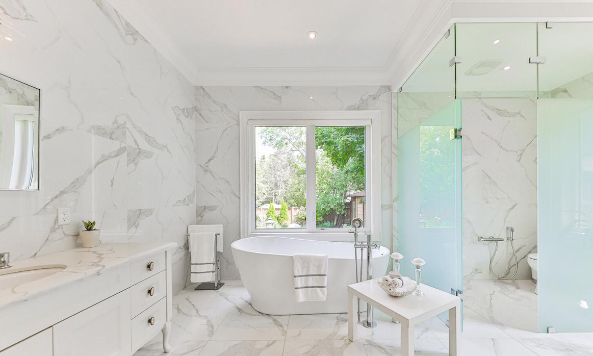 The adjoining 5-piece ensuite is a haven of indulgence, featuring a custom double sink vanity with marble countertops and ample lower cabinetry, complemented by a full-width mirror. The walk-in glass shower is a spa-like retreat, showcasing a waterfall shower head, detachable wand, body jets, and a steam system, all set against a backdrop of porcelain tile. The deep soaker tub with a freestanding wand promises relaxation, while the walk-in glass water closet, complete with a handheld bidet faucet and tile surround, adds a touch of refinement.
