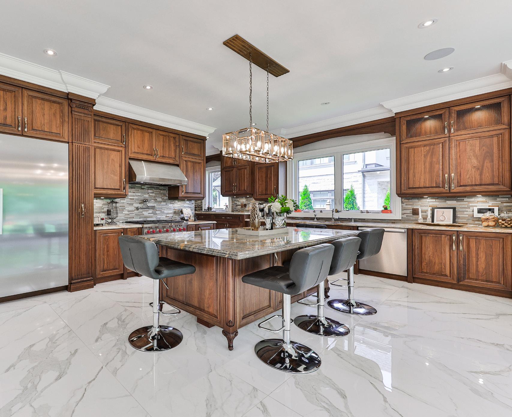 The kitchen is a culinary masterpiece, embodying both sophistication and practicality. Custom solid walnut cabinetry, adorned with elegant undermount lighting, graces both upper and lower storage areas, while the quartzite countertops and matching tile backsplash create a striking, seamless look. The oversized centre island, with its lustrous quartzite surface, features custom-built cabinetry and barstool seating, making it the perfect centerpiece for casual dining or entertaining.