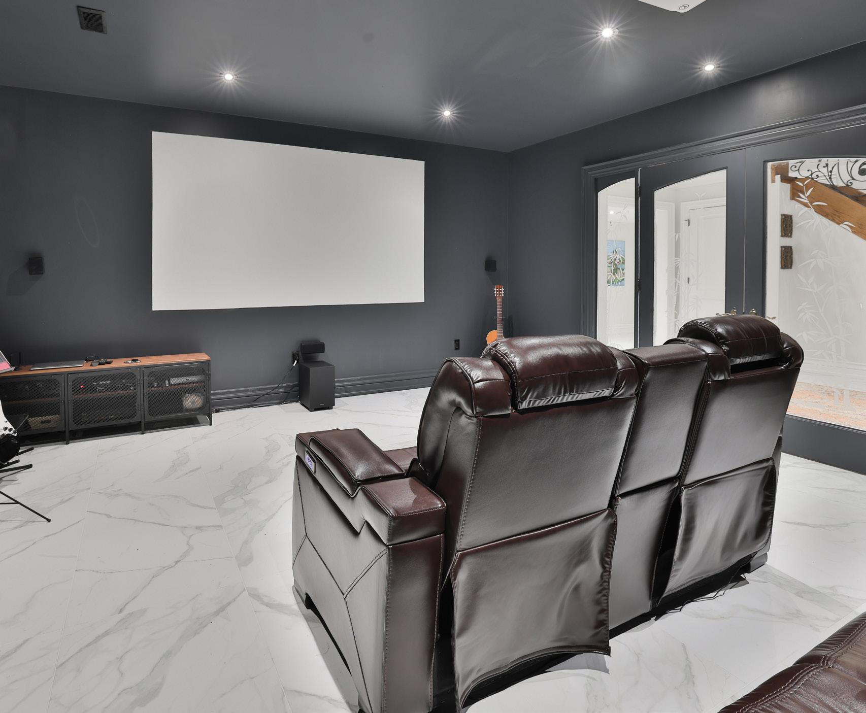 The lower level offers a full spectrum of entertainment and functionality. A large recreation room serves as the focal point, featuring a gas fireplace with quartzite surround, a wet bar with wine storage, and a spacious seating area. The theatre room, complete with projector offers a cinematic experience at home. The home gym, with its own ensuite bathroom, caters to wellness and flexibility.