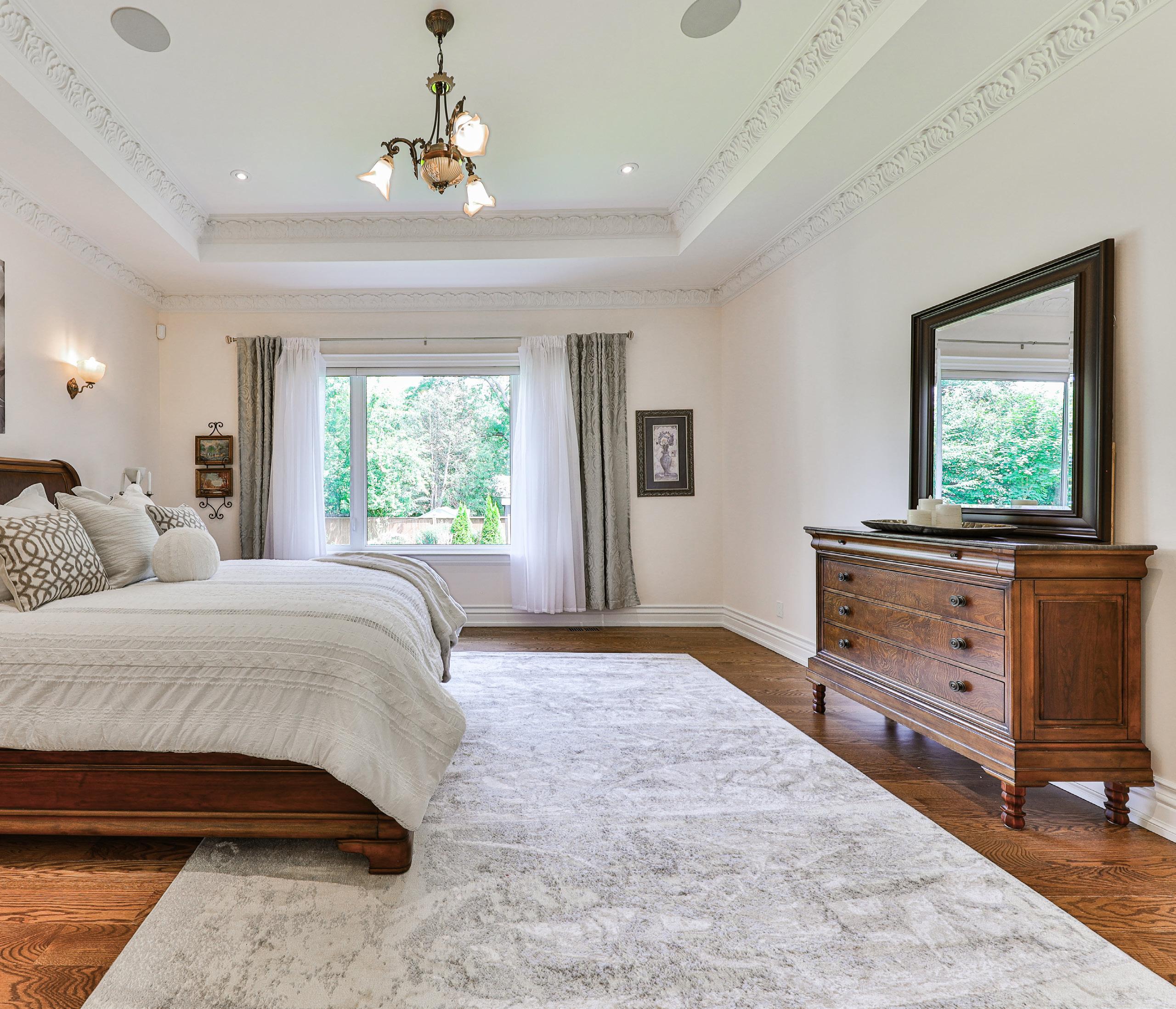 The main floor’s primary bedroom is a testament to its opulent design and ultimate comfort. Upon entering through the grand double doors, you are greeted by a serene and light-filled retreat, thanks to a striking picture window that offers tranquil views. The room is adorned with a precast decorative limestone archway, which elegantly frames the entrance and adds a touch of classic sophistication.