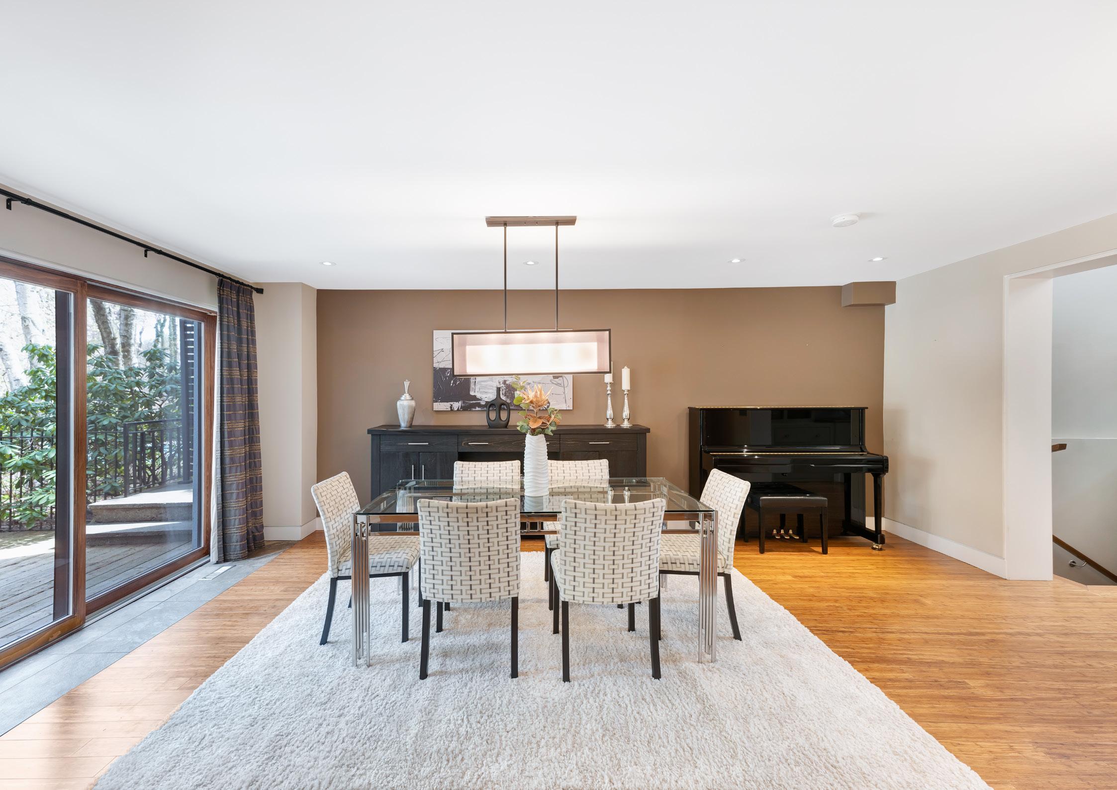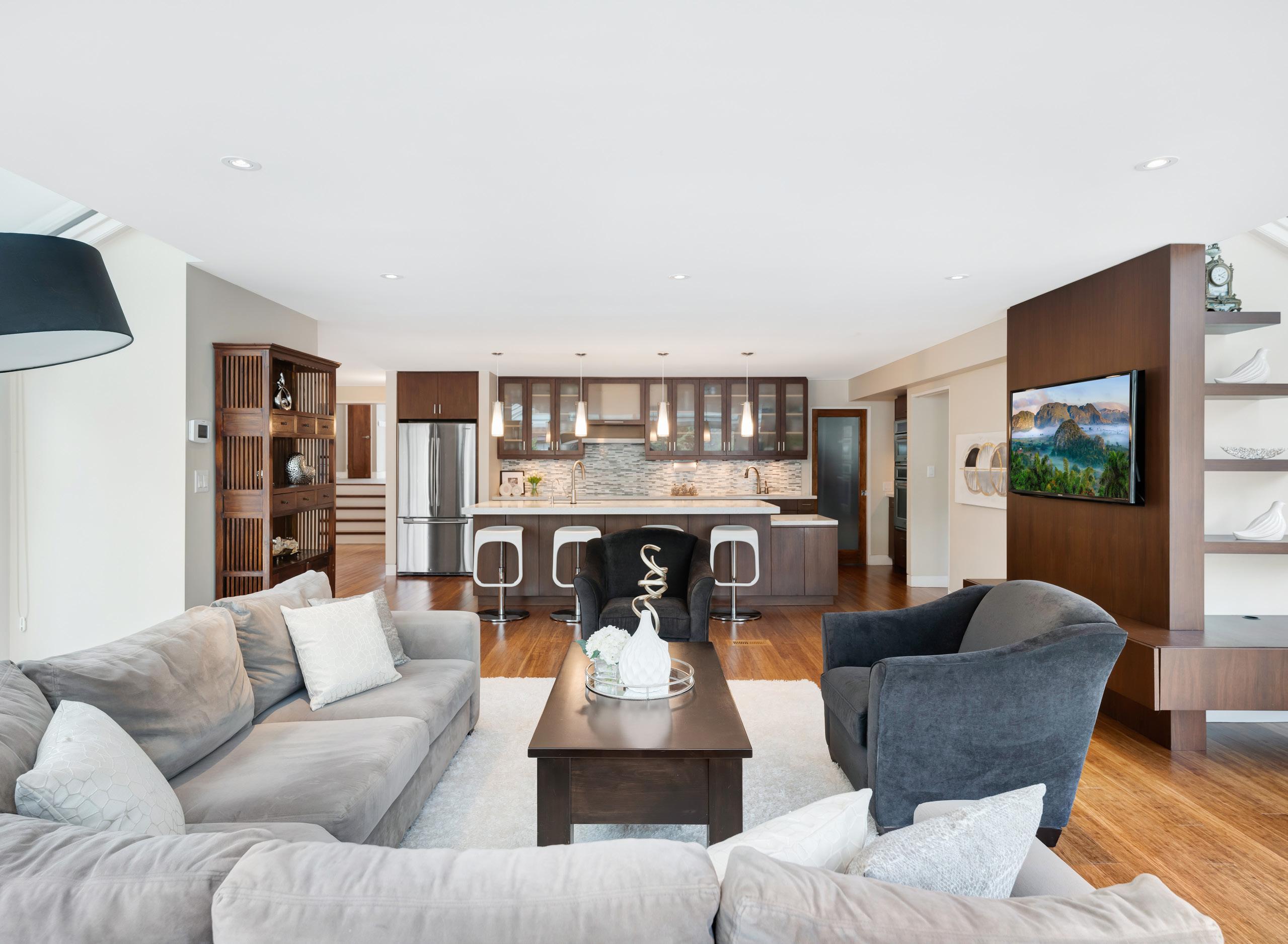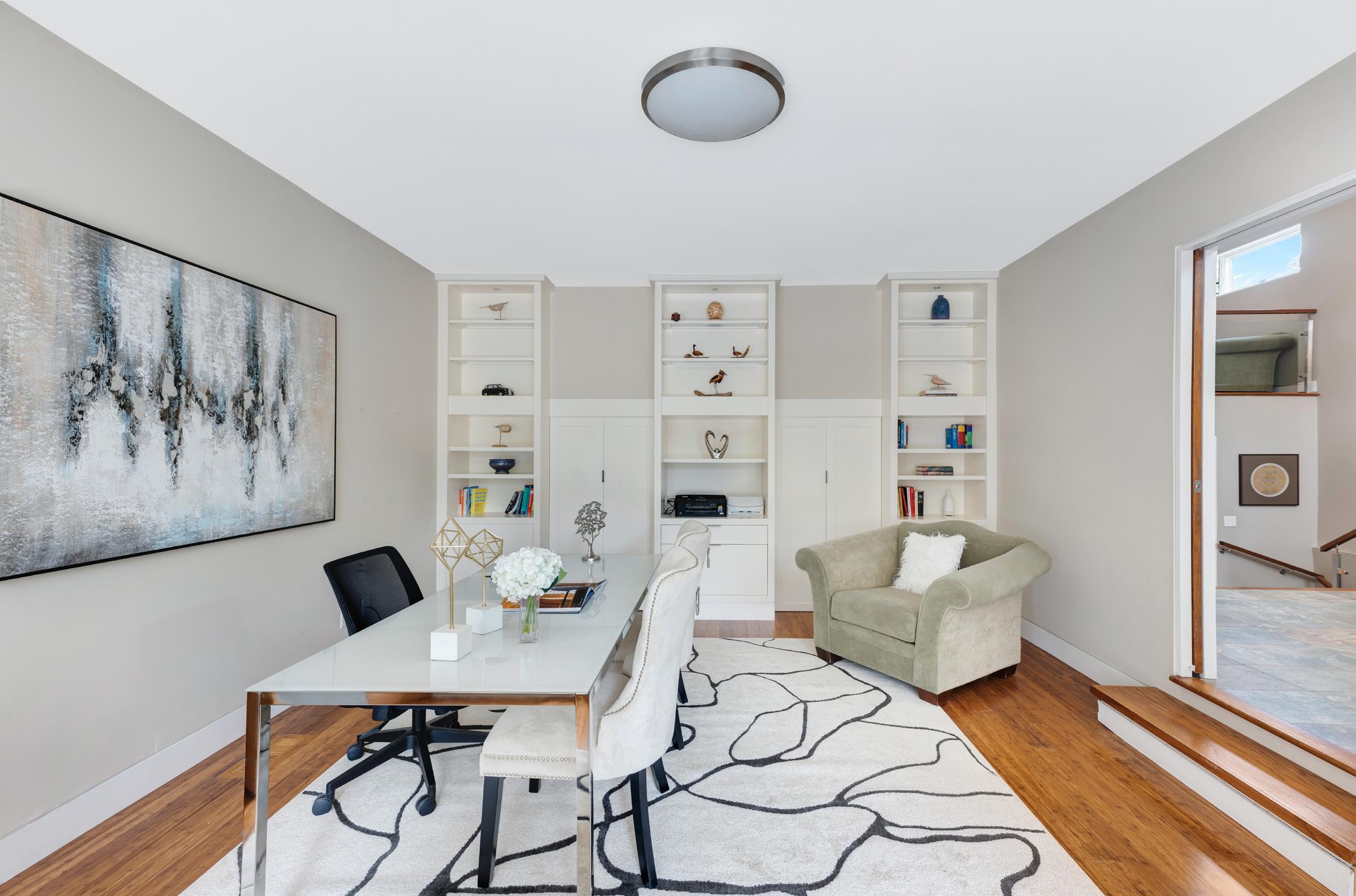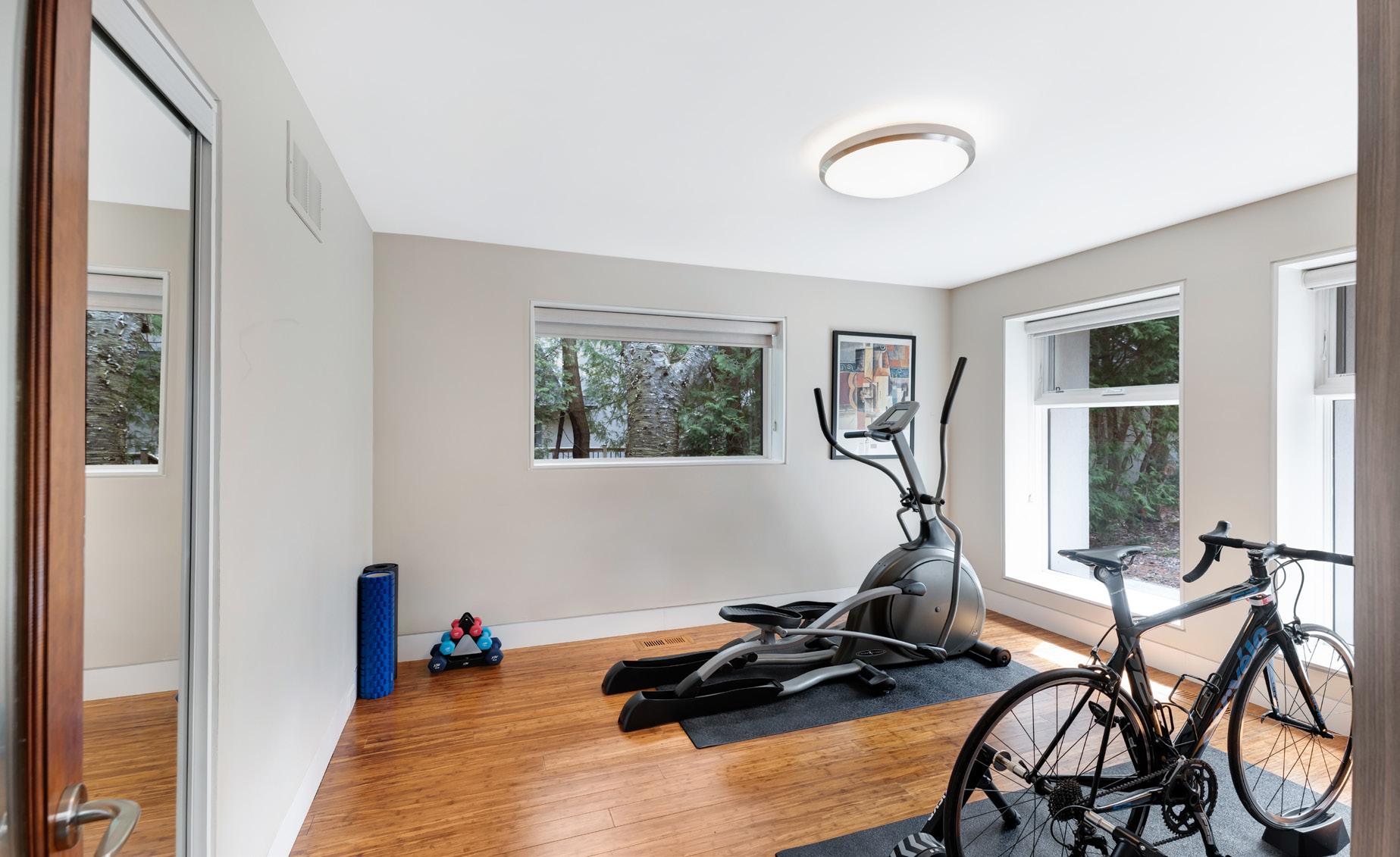 As you enter this property, you will be greeted by a light-filled 2-storey foyer with large transom windows, sidelight windows, and clerestory windows. On one side, there is a spacious guest suite with a 3-piece ensuite and a home gym, and on the opposite side, you will find a sunny home office with custom built-ins and storage.