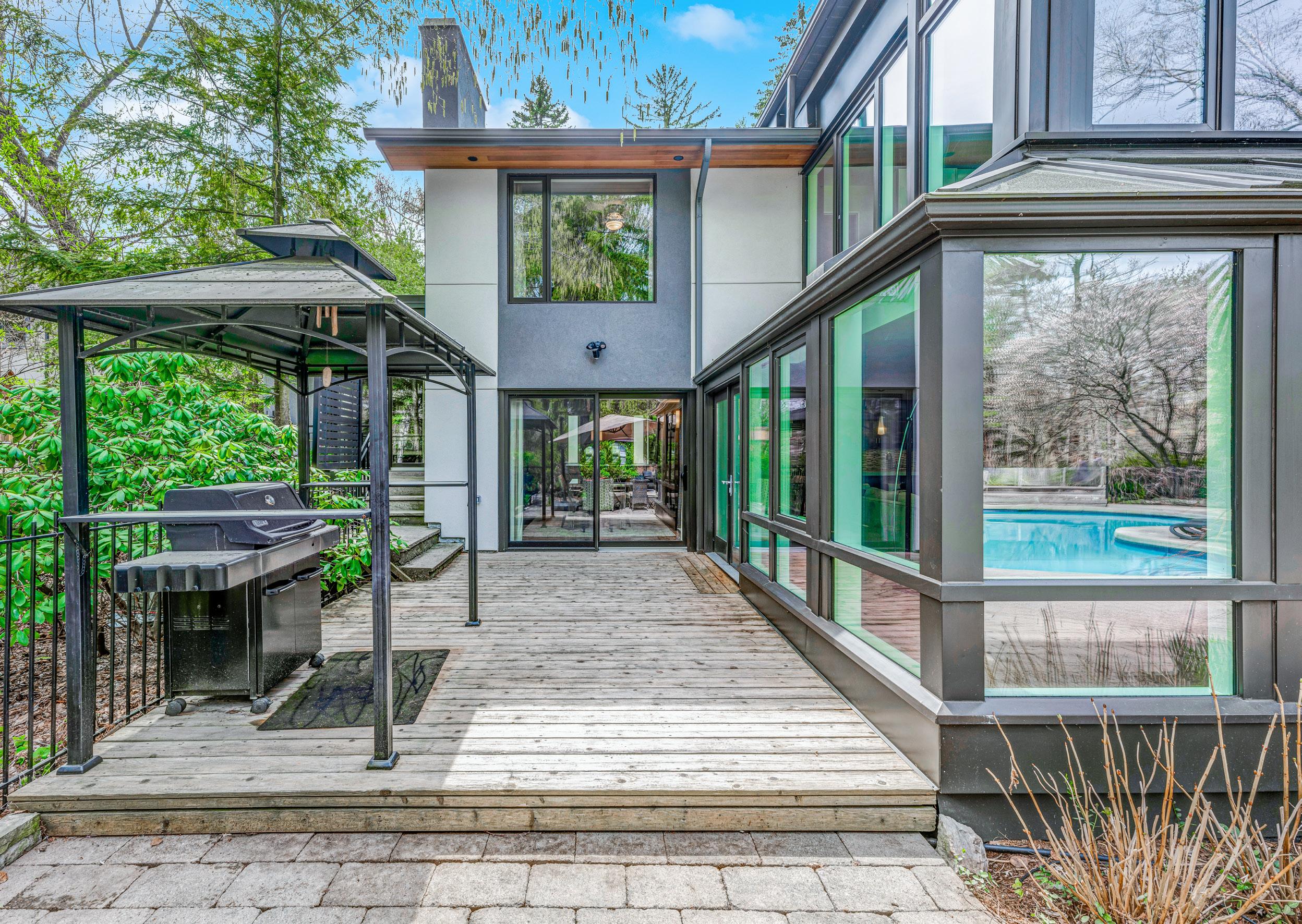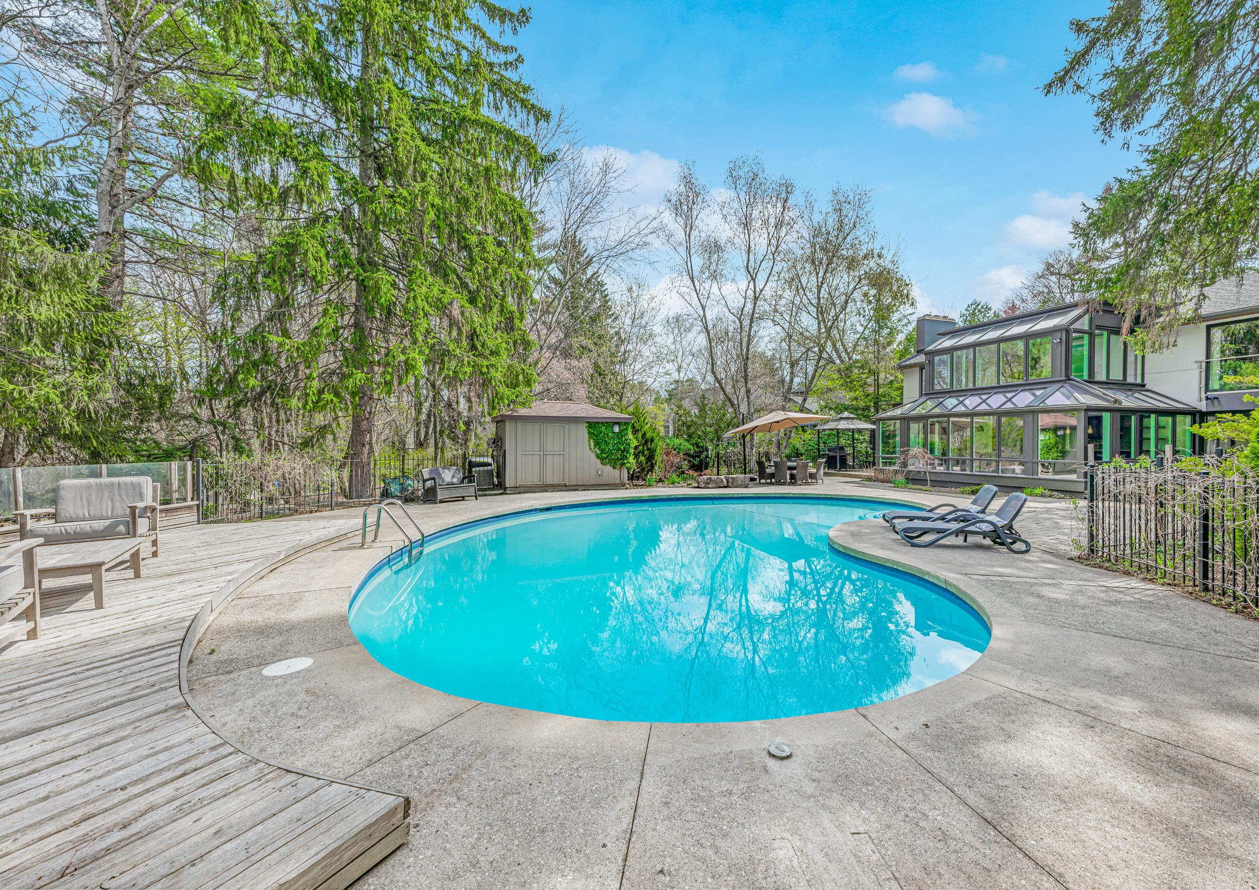 This property features an expansive Muskoka in the City backyard retreat that backs onto Kenollie Creek, offering a serene and peaceful escape from city life. The backyard features a Marbelite chlorine pool plus a pool shed with an outdoor shower and changing room.