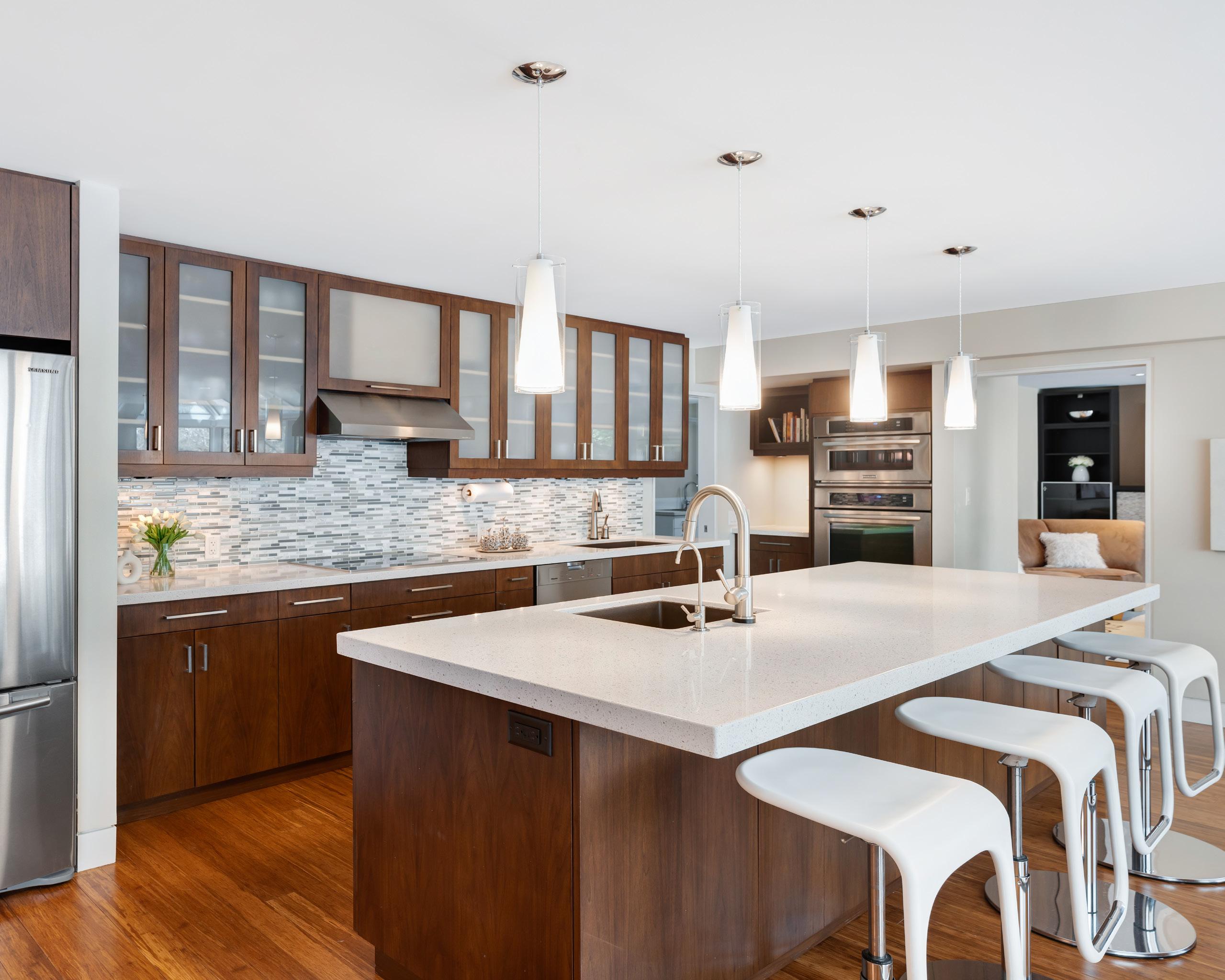 Experience the ultimate in luxurious comfort with a generously sized kitchen that is designed to meet your unique needs. The custom-designed kitchen overlooks the great room and dining room, boasting wood upper cabinets with frosted glass inserts, slab-style wood lowers, and elegant Caesarstone countertops with a marble mosaic backsplash.