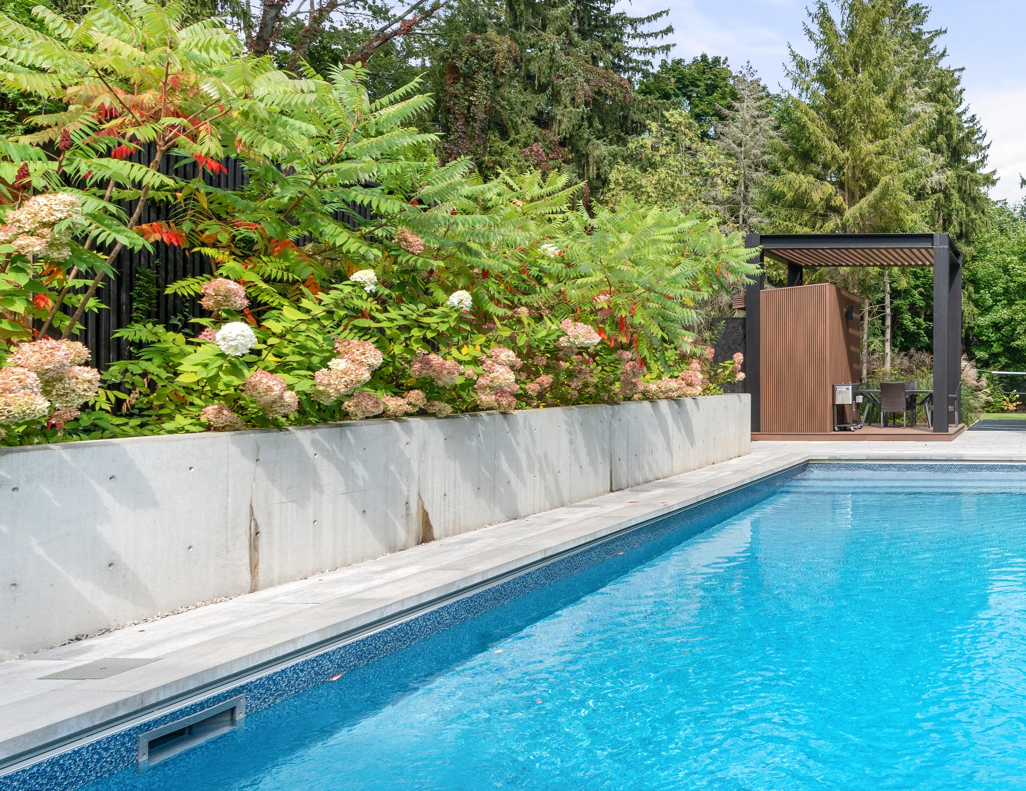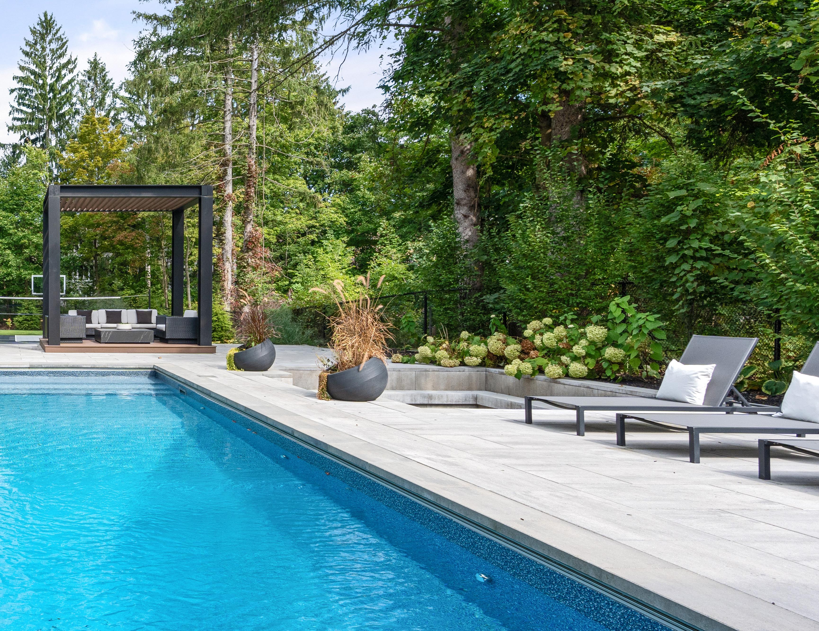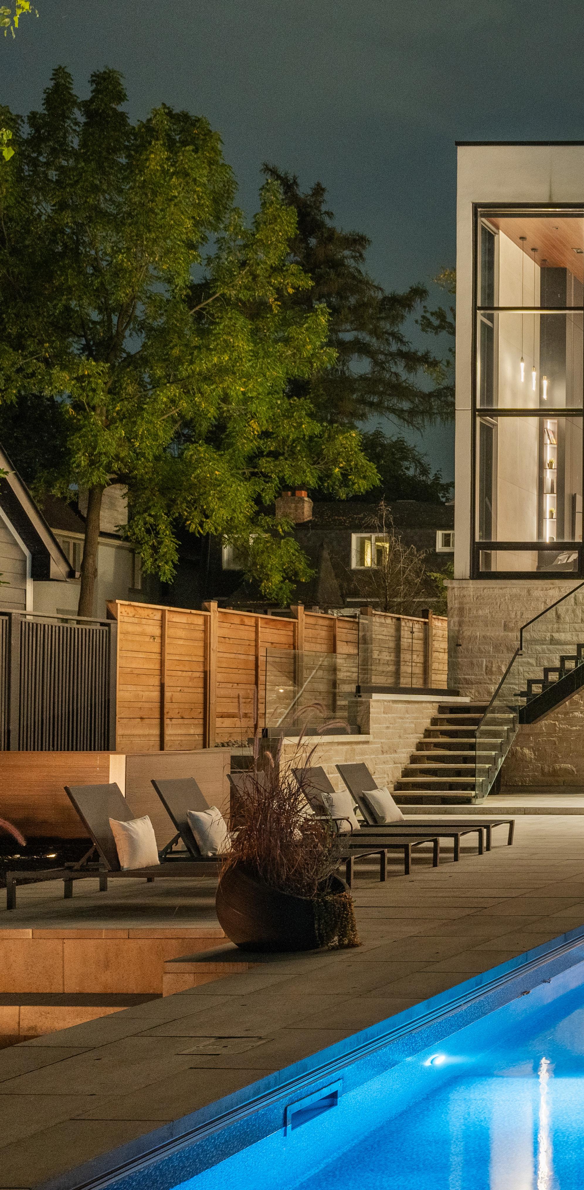 At the heart of the backyard, a saltwater pool beckons for a refreshing dip framed by sunken bench seating with a fireplace table, creating an idyllic spot for relaxation and conversation as you unwind by the flickering flames. Two contemporary custom-built pergolas adorned with custom millwork create additional seating areas, perfect for lounging in style while enjoying the beauty of the surrounding landscape.
