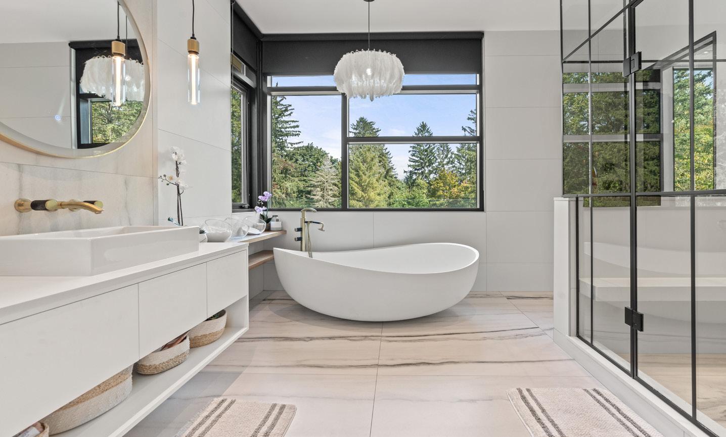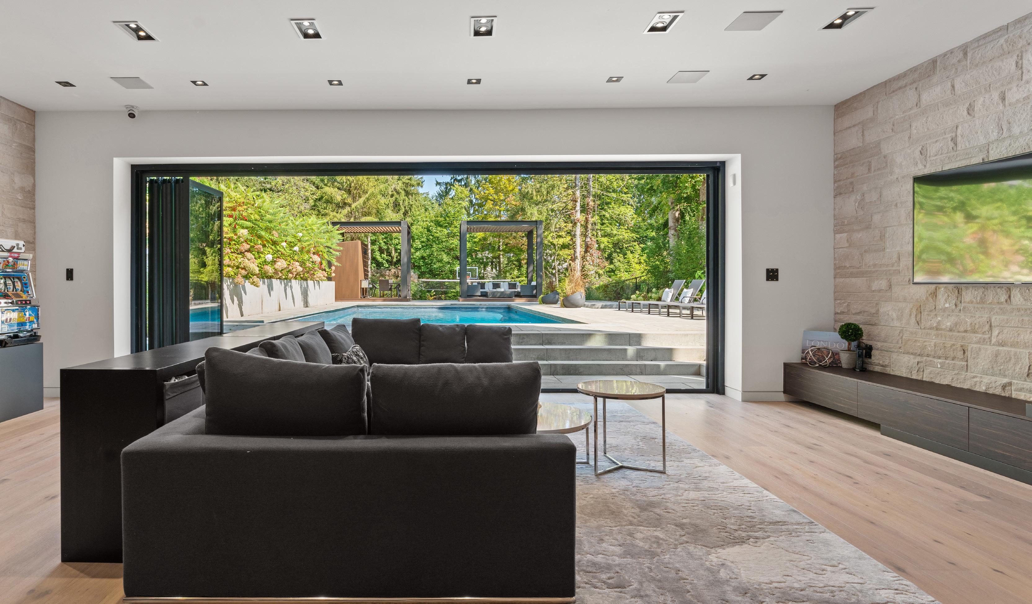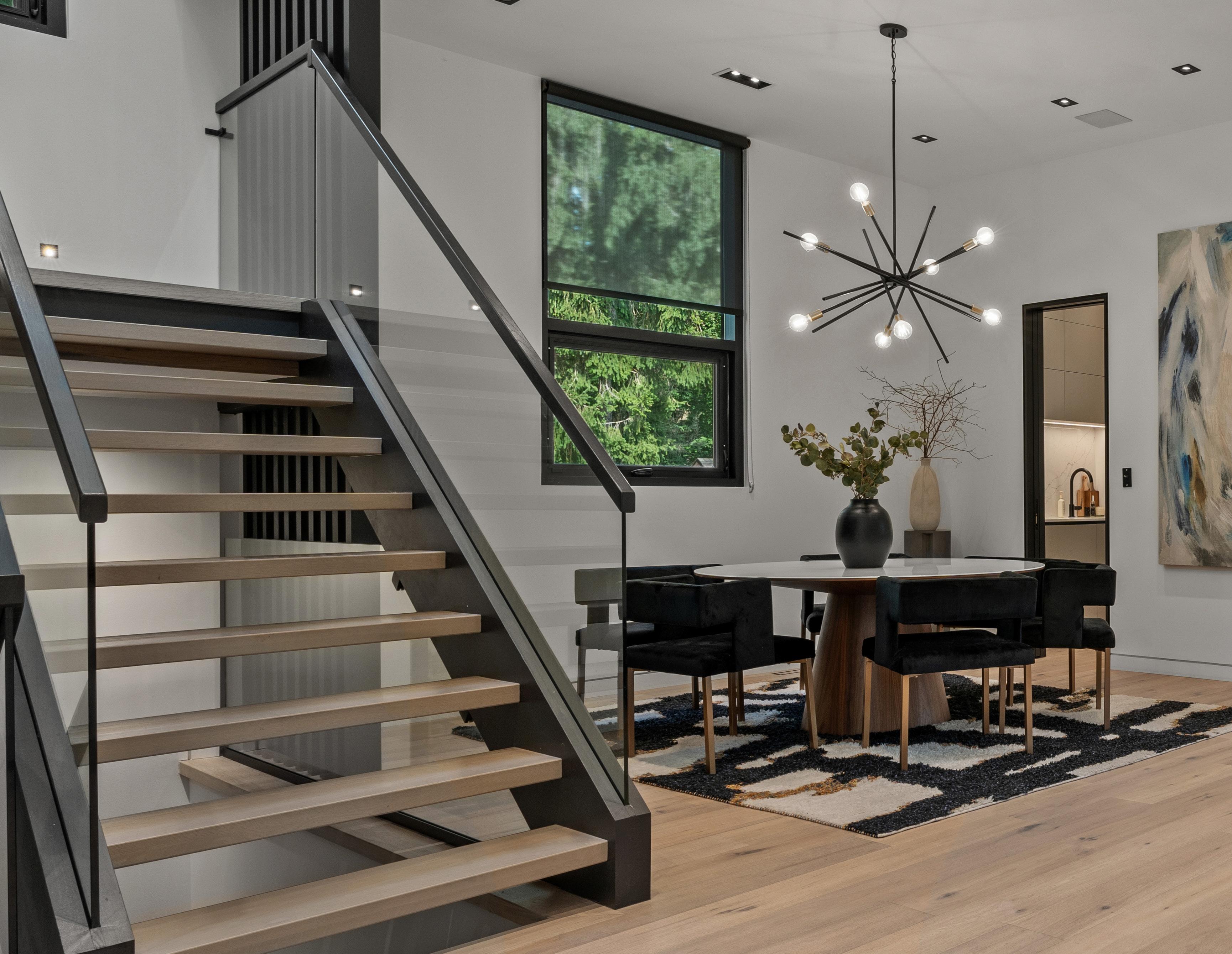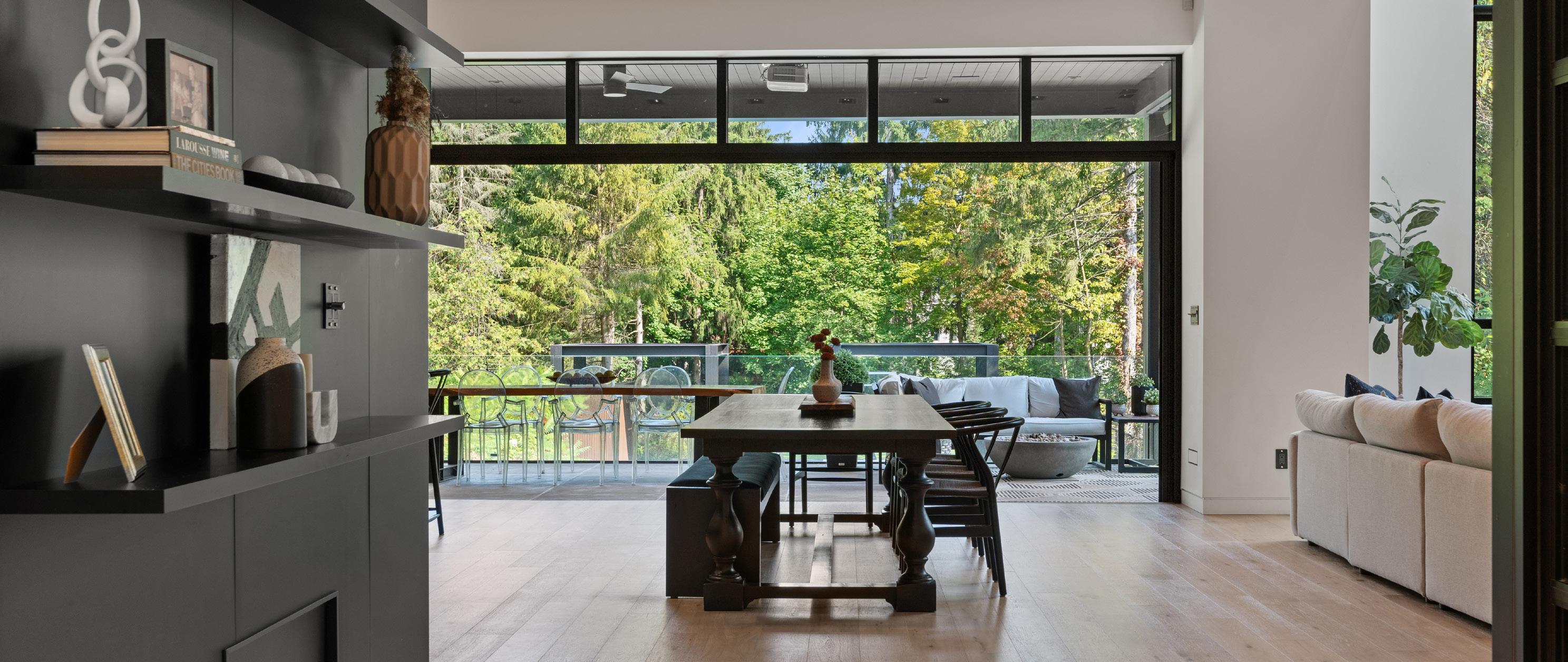 The kitchen’s bi-fold nano wall opens to the backyard deck, blending indoor and outdoor living for effortless entertaining. Wide plank white oak hardwood floors run throughout, adding warmth and character.