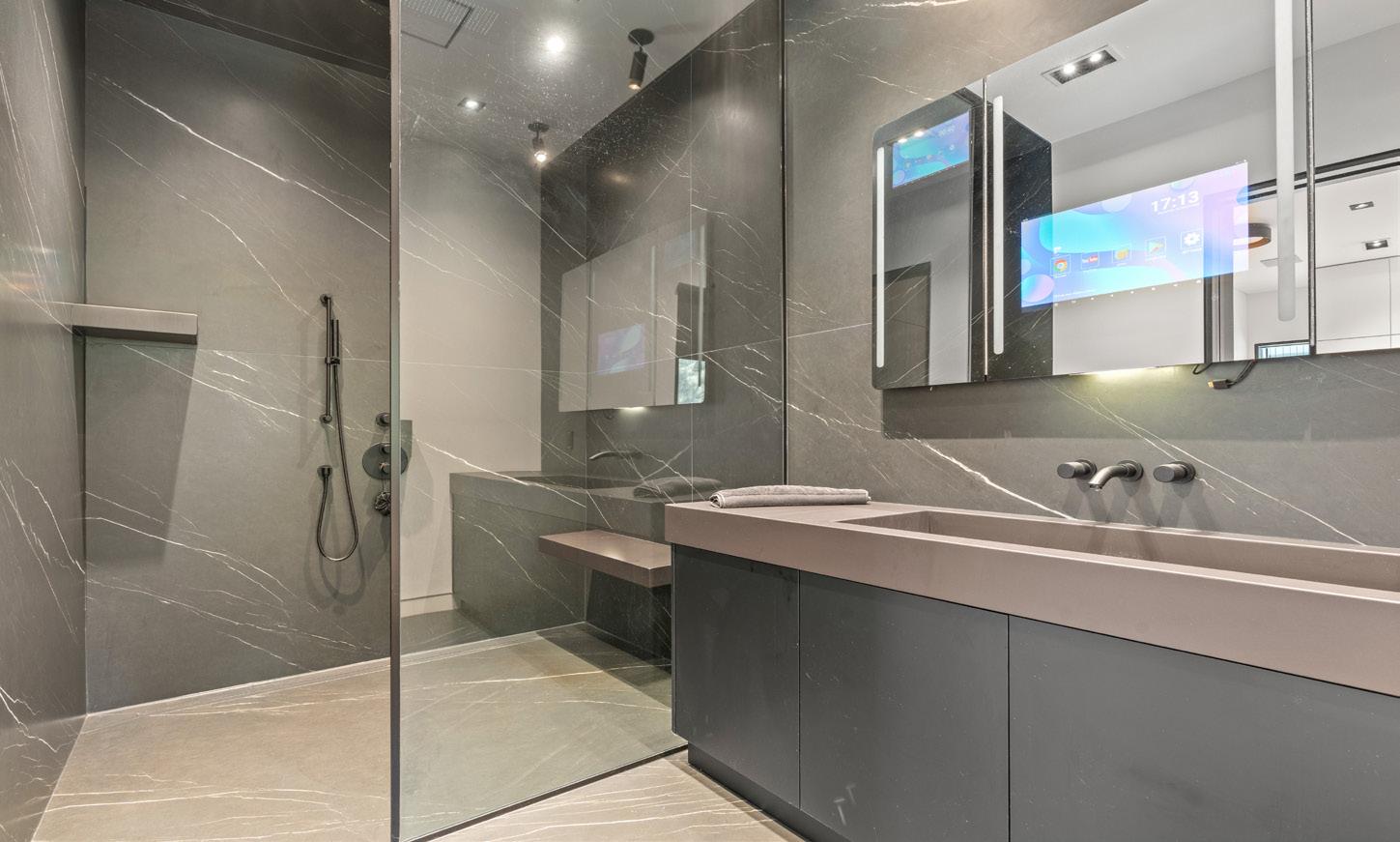 His ensuite continues the theme of luxury with a custom built-in single sink vanity featuring lower cabinetry for discreet storage. The QAIO three-panel smart mirror and heated floor thermostat provide modern comfort, while the walk-in glass shower complete with a waterfall showerhead, detachable wand, shower bench, and elegant marble surround offers a refreshing retreat. Built-in ceiling speakers enhance the experience, while convenient access to the walk-in closet completes this magnificent personal oasis. This primary bedroom is not merely a room, it’s an invitation to a lifestyle of extravagance, comfort, and tranquility, tailored for those who appreciate the finer things in life.