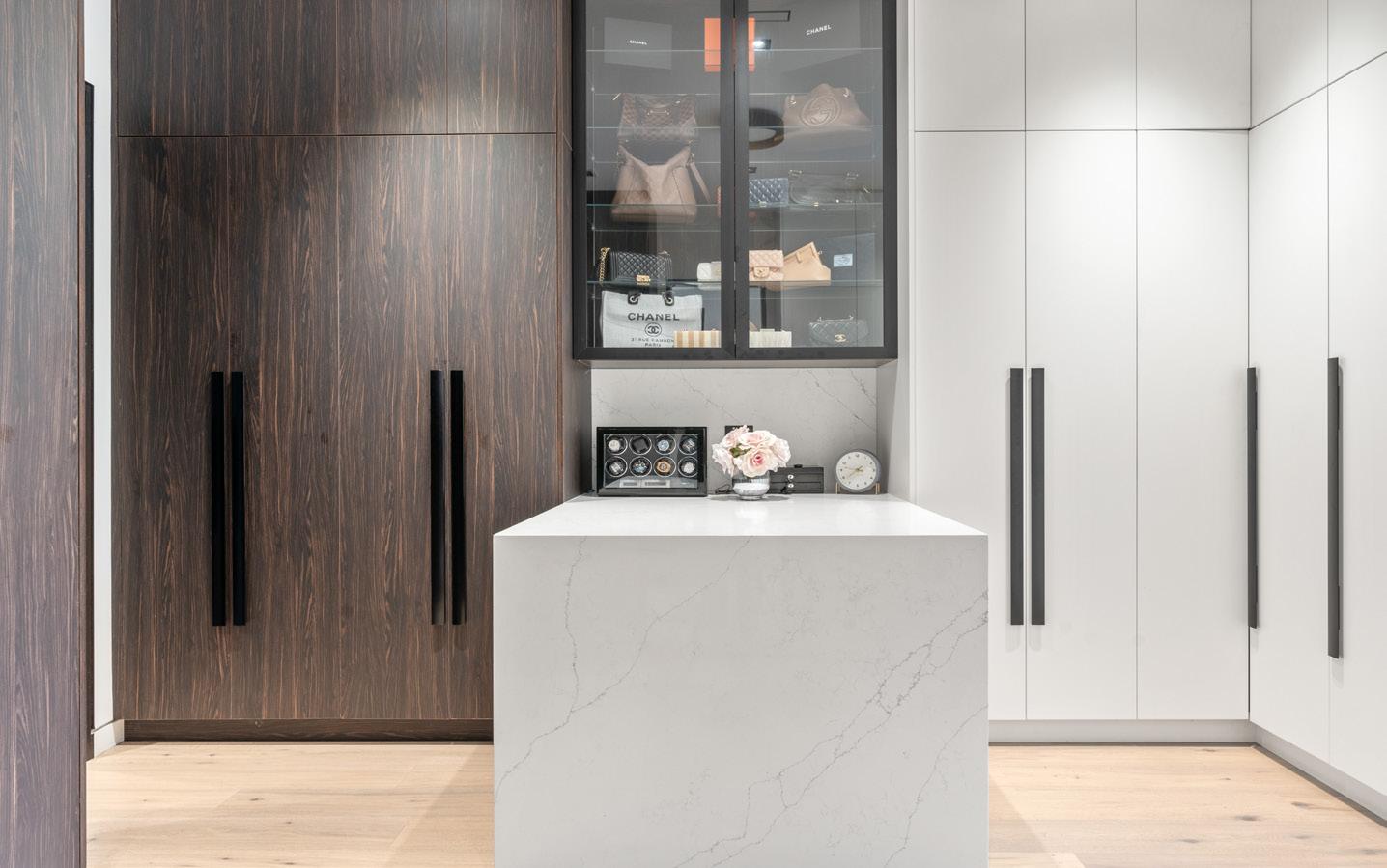 Designed with thoughtful details, this primary bedroom includes built-in ceiling speakers, custom full-height millwork, and an array of hanging pendant lights, light fixtures, and pot lights that illuminate the room with a warm glow. The expansive walk-in closet is a fashion lover’s dream, featuring floor-to-ceiling cabinetry with custom built-ins and glass insert shelving, as well as marble Carrara countertops that offer a touch of refined sophistication, all while ensuring that your wardrobe remains impeccably organized.