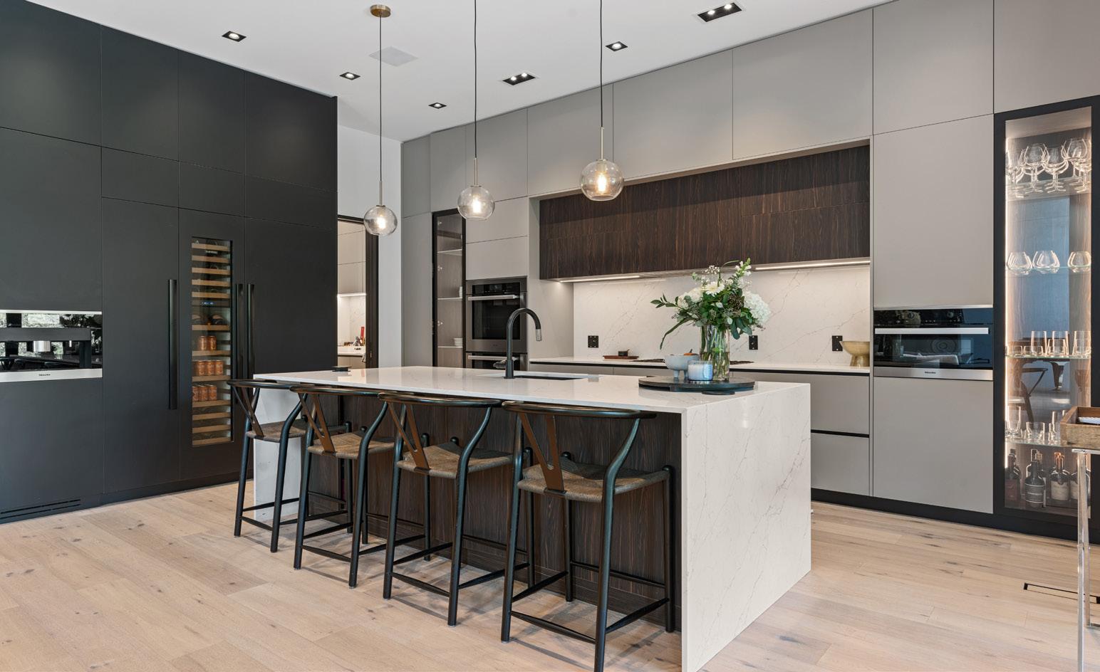Adding to the functionality of the space is a single undermount sink, complete with a gooseneck sprayer and garburator, while custom cabinetry and drawers provide ample storage for all your kitchen essentials. Built-in ceiling speakers enhance the ambiance, whether for quiet mornings or festive gatherings.