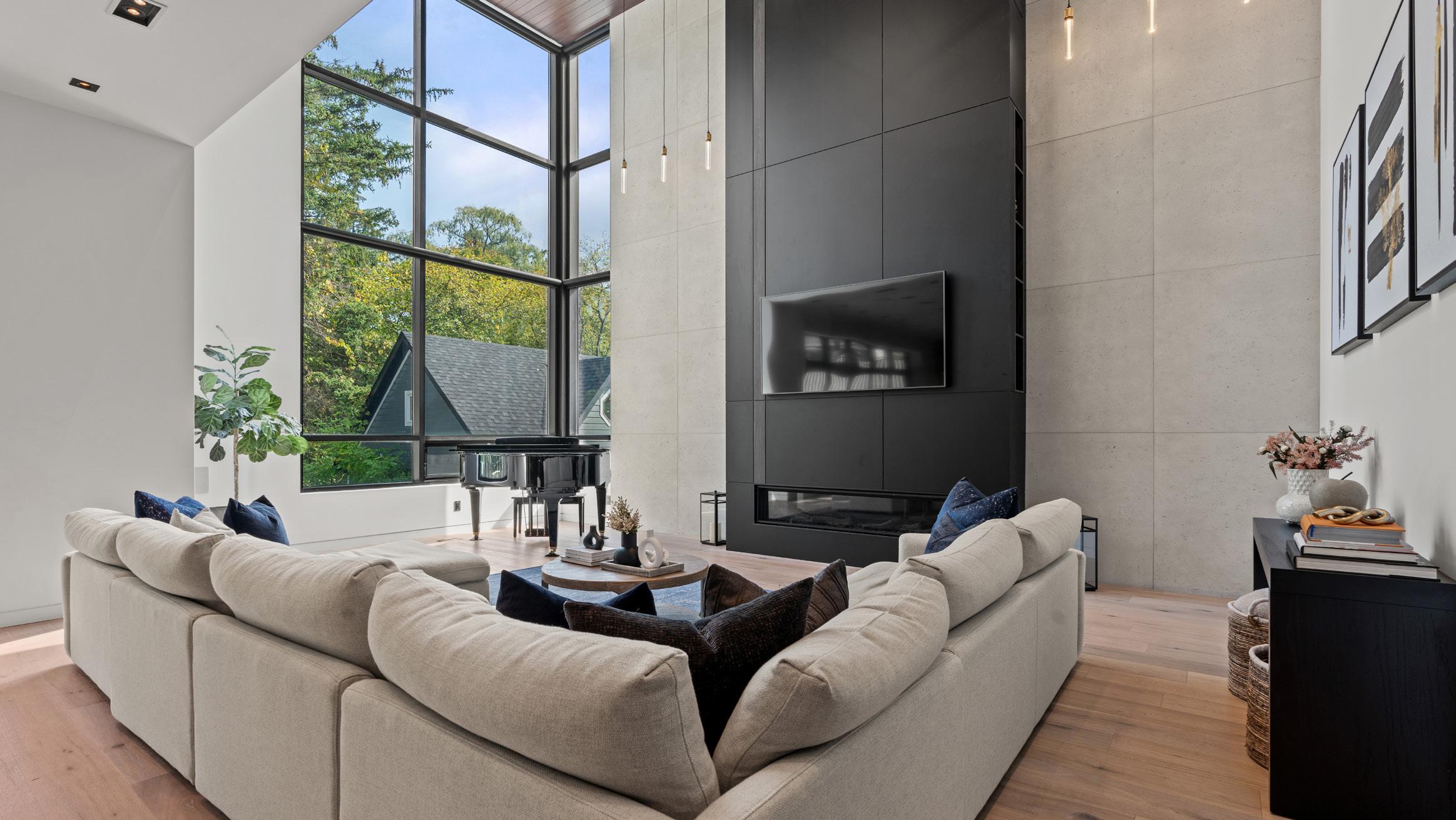 Soaring 2-storey ceilings define the grand family room, where contemporary luxury meets warmth and comfort. Anchored by a gas fireplace framed by a dramatic full-height feature wall, the room boasts custom shelving and exquisite charcoal stonework. Full-height windows flood the space with natural light, while a double-door glass-insert wine rack adds a touch of sophistication. Built-in wall speakers and modern lighting fixtures, including a pendant light, complete this impressive space, making it the perfect backdrop for family relaxation or stylish entertaining.
