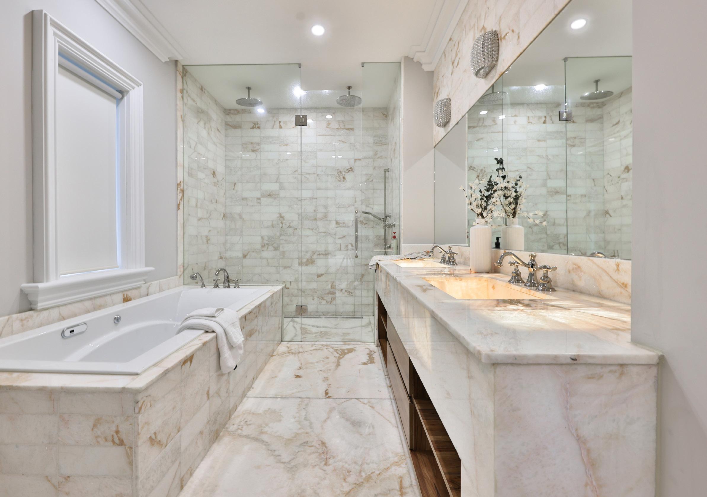 The primary ensuite is a true sanctuary of opulence and indulgence, providing a spa-like retreat within the comfort of your own home. Prepare to be enchanted by the glass walk-in shower, adorned with onyx tile flooring and surround, featuring two waterfall shower heads and one detachable wand for an invigorating bathing experience. For moments of pure relaxation, the jacuzzi tub offers a tranquil escape from the outside world. The primary ensuite is not just a functional space, but a haven of elegance and rejuvenation, where you can escape the daily hustle and immerse yourself in the lap of luxury.