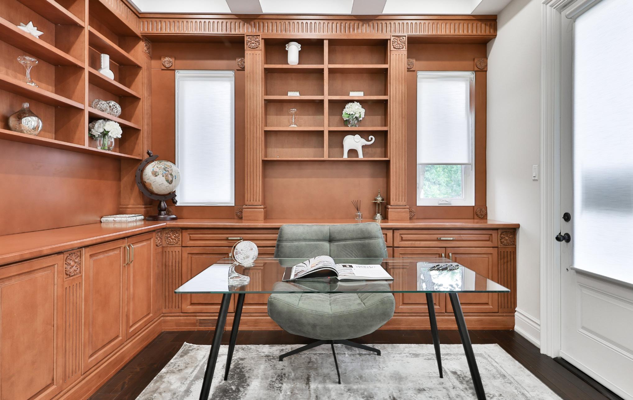 The front sitting room offers a seamless connection to the outdoors with its walk-out to the patio, complemented by a large floor-to-ceiling window overlooking the picturesque front yard. In the Office, productivity meets elegance with its floor-to-ceiling built-in custom bookcase, providing ample storage space. Enjoy the serene views of the side yard through two casement windows. Step into the Family Room, where grandeur unfolds with its impressive 20-foot coffered waffle design ceiling and a stunning full-height limestone mix feature wall. The wood-burning fireplace, adorned with a custom limestone mix mantle and surround, becomes the centerpiece of comfort. Flooded with natural light through three transom windows, this room opens up to the eat-in kitchen, making it an ideal space for gatherings.