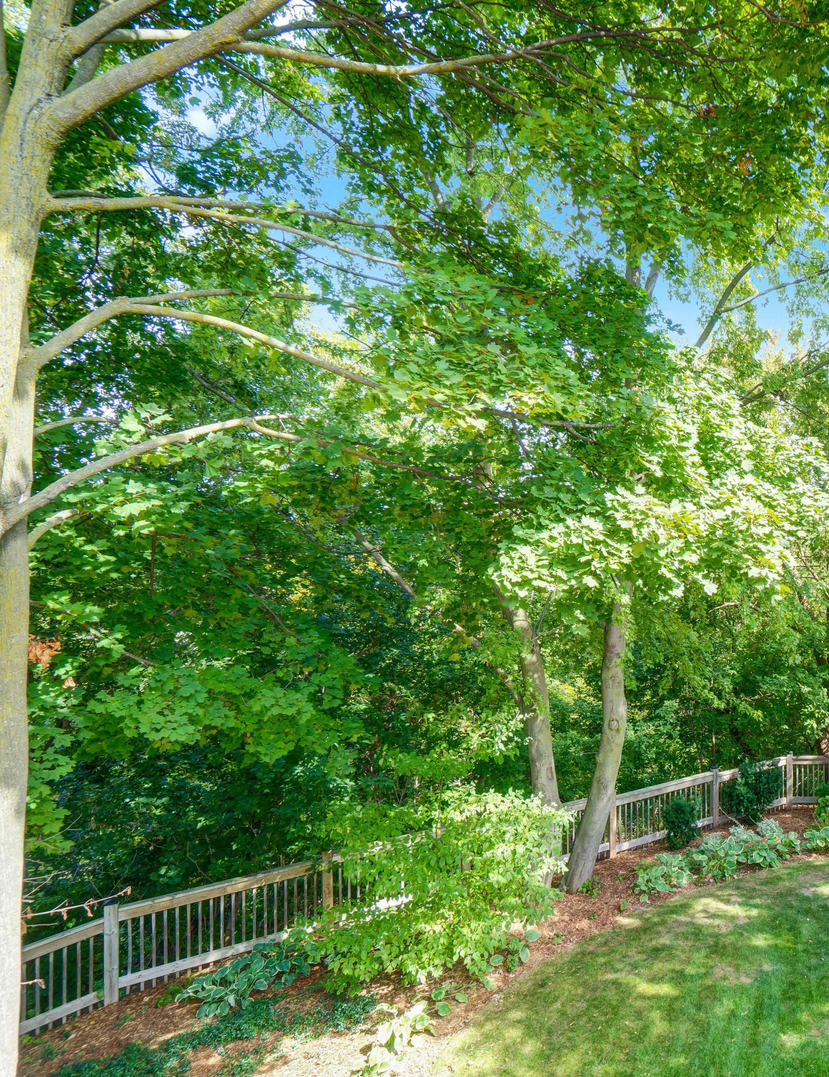 The front, side, and backyard are professionally manicured blending with the breathtaking beauty and abundance of mature trees and lush greenery surrounding the ravine. The landscaping features an armour stone patio and two composite decks from which to admire the grounds.