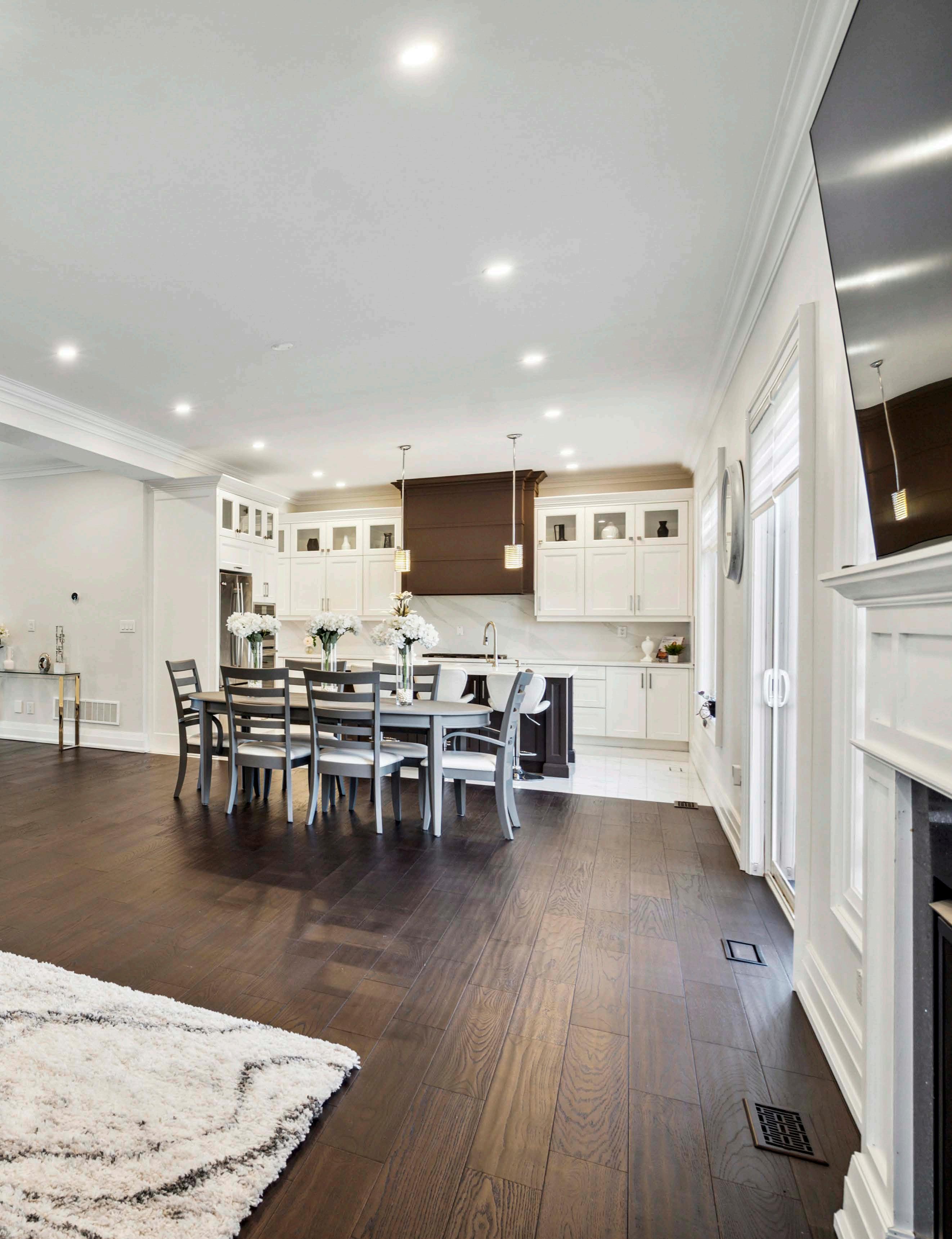 Details and size matter when you are taking care of your family’s daily meals. The resplendent and vast contemporary kitchen overlooks the backyard and includes luxury appliances, quartz countertops and backsplash, a two-toned centre island, barstool seating, large pantry, stylish pendant lighting, and custom white shaker soft close cabinetry that elegantly blends with the porcelain floors.