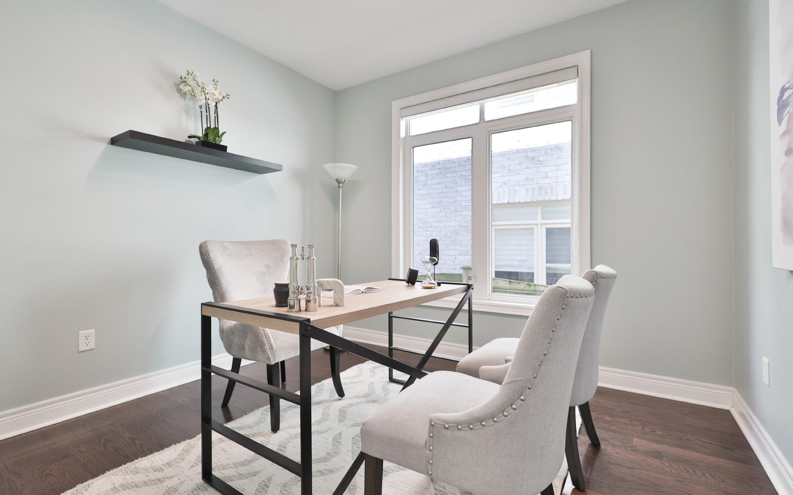 A versatile and thoughtfully designed space, the office offers a quiet retreat for work, study, or creative pursuits. A large window with a transom accent fills the room with natural light, fostering productivity and focus throughout the day. The soft illumination from the overhead light fixture creates a calm, inspiring atmosphere, making this room an ideal blend of elegance and practicality for today’s modern lifestyle.