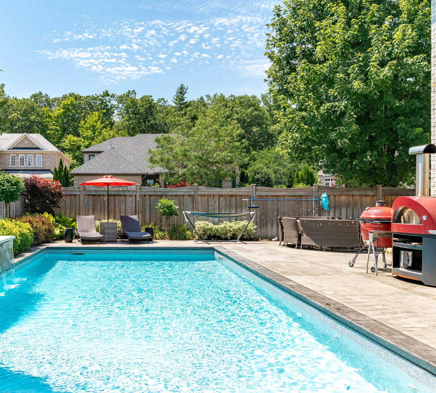 A pool cabana with windows provides the perfect space for changing, relaxing, or enjoying a shaded retreat while watching the family enjoy the water. Professionally landscaped trees and lush bushes frame the yard, offering privacy, tranquility, and a vibrant backdrop for every occasion. The ALFA pizza oven invites culinary adventures, perfect for leisurely weekend gatherings with friends or intimate family dinners under the stars.
